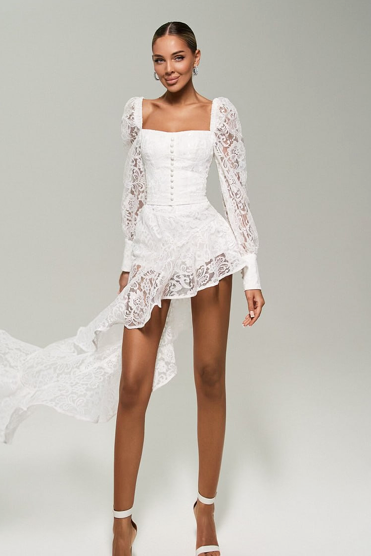 - A modell szexi szabású, aszimmetrikus kialakítású, teljes hosszában csipkével és puffos ujjal rendelkezik.