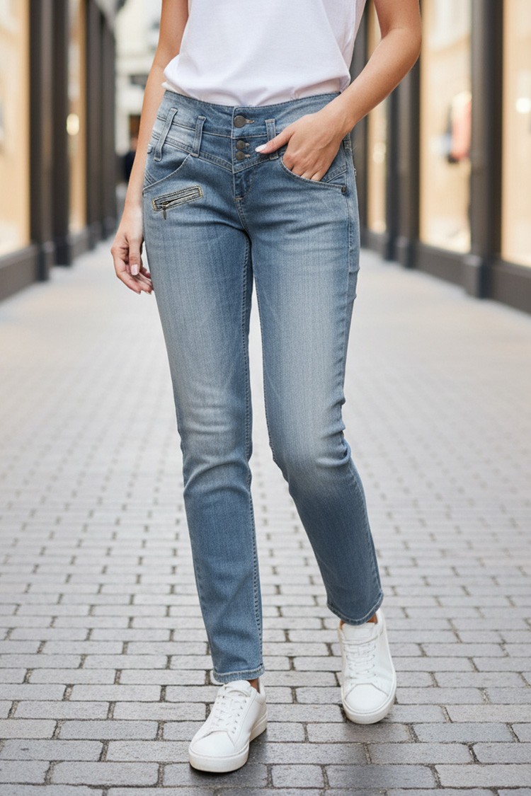 - A középmagas derék tökéletes illeszkedést biztosít. A modell gombokkal rögzíthető.