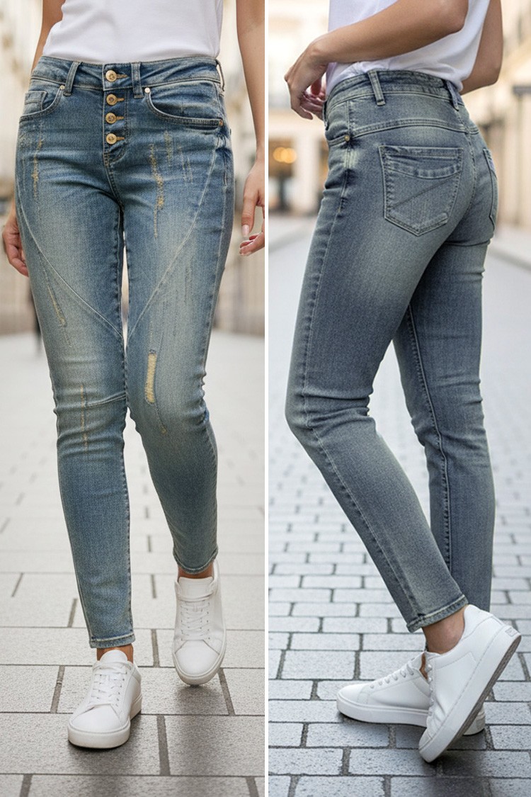 - A középmagas derék tökéletes illeszkedést biztosít. A modell gombokkal rögzíthető.
