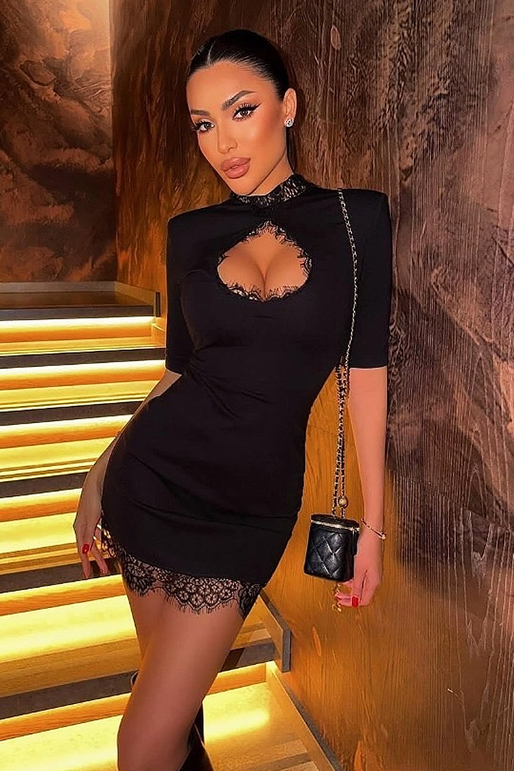 - A modell látványos kivágott nyakkivágással, rövid ujjal és csipke részletekkel rendelkezik.