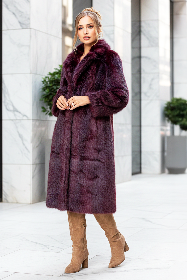 - A modell midi hosszúságú és kényelmes szabású, bő gallérral és bordó színnel rendelkezik.