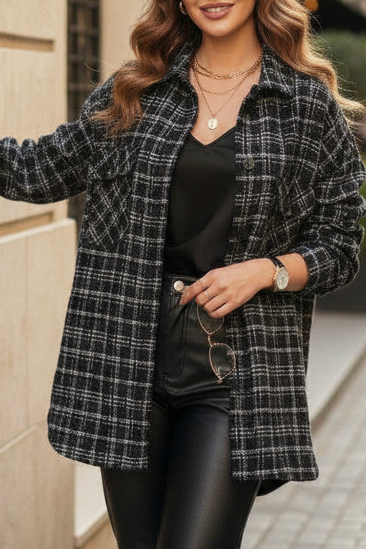 - A modell klasszikus hosszúságú, gallérral, dísz zsebbel és gombokkal rendelkezik.