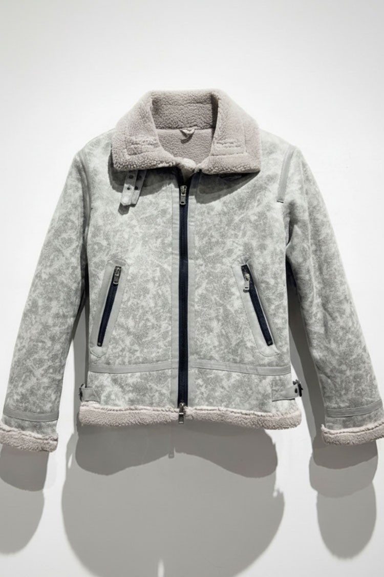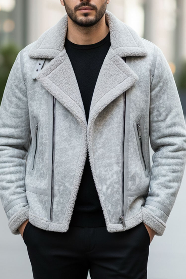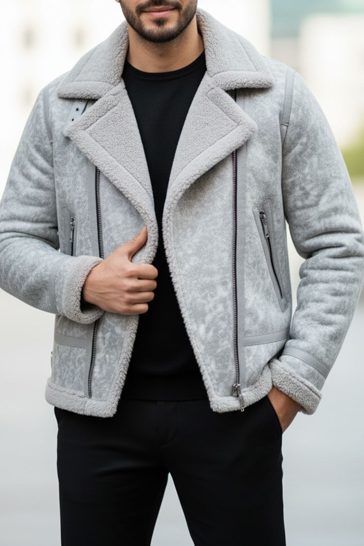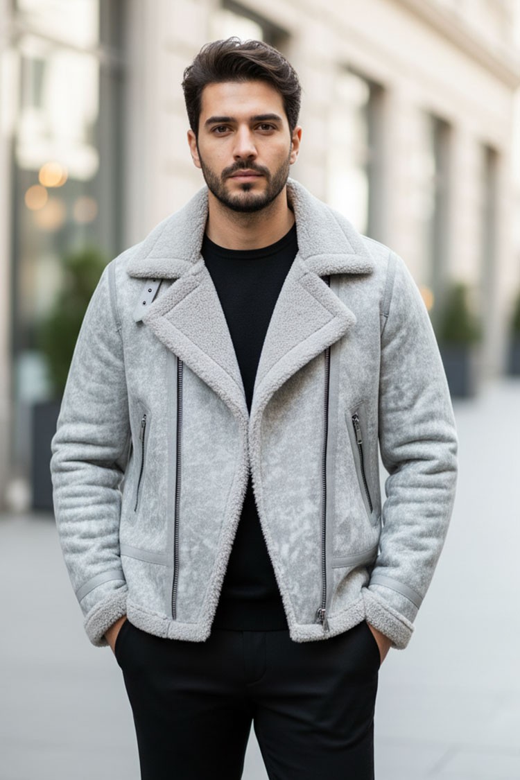 - Vonzó dizájnú férfi kabát bolyhos gallérral a stílus és a kényelem érdekében a hűvösebb napokon.
