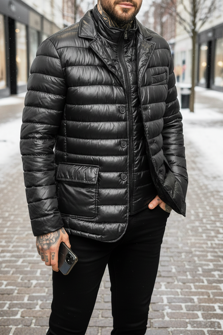- Kényelmes férfi dzseki vízszintes, steppelt mintával és hajtókával, fekete színben, sportos-hétköznapi stílusban.