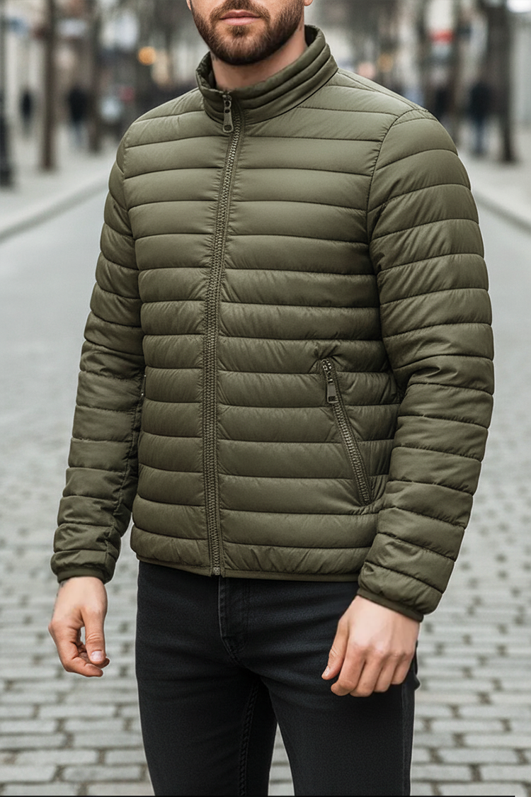 - Kényelmes férfi dzseki vízszintes, steppelt mintával és zsebekkel khaki színben, sportos-hétköznapi stílusban.