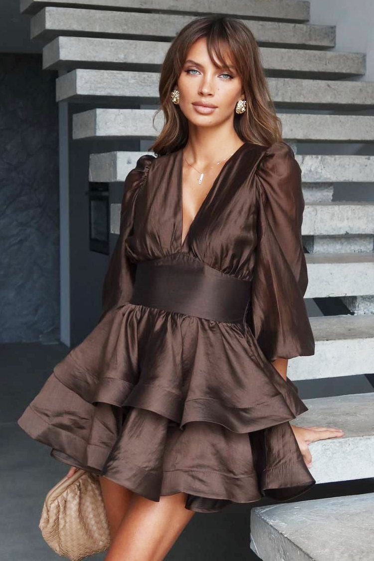 - Válaszd ezt a barna mini ruhát, amely bármilyen különleges alkalomra és partira is alkalmas.