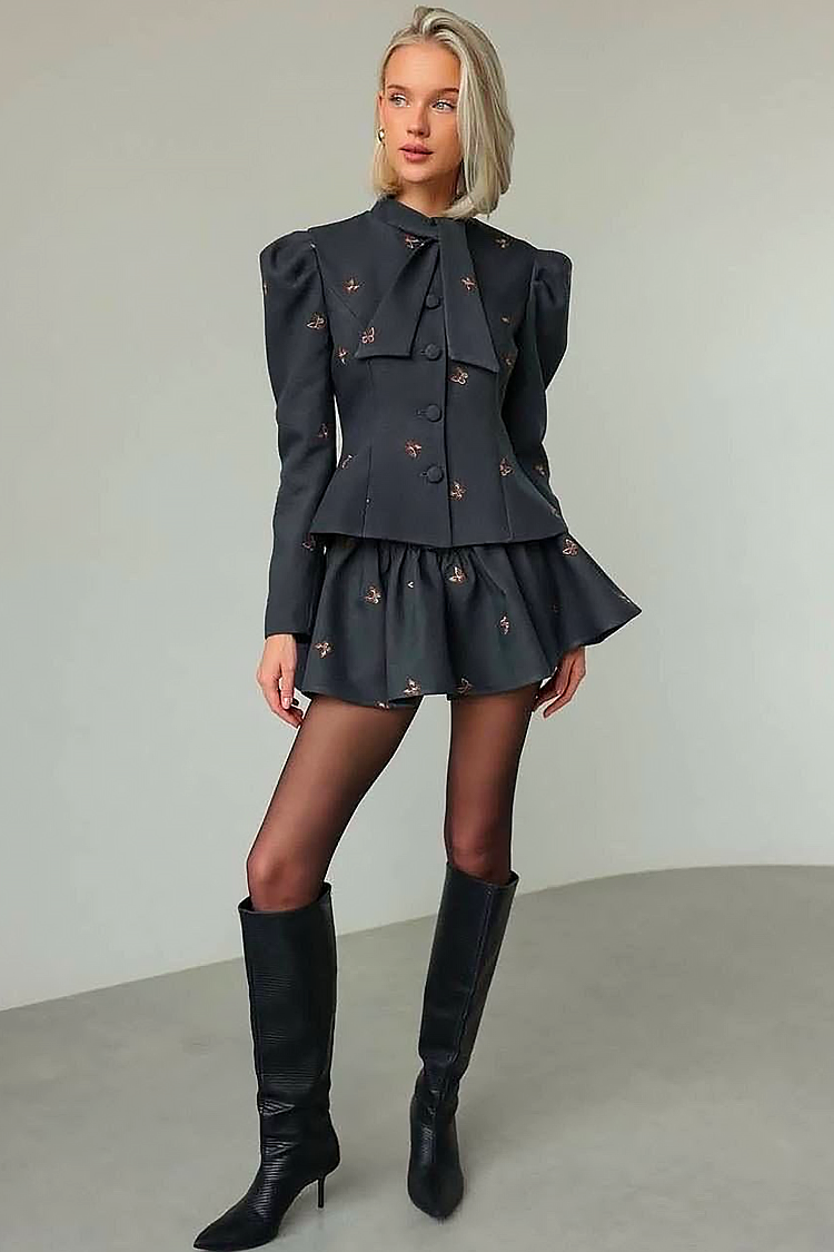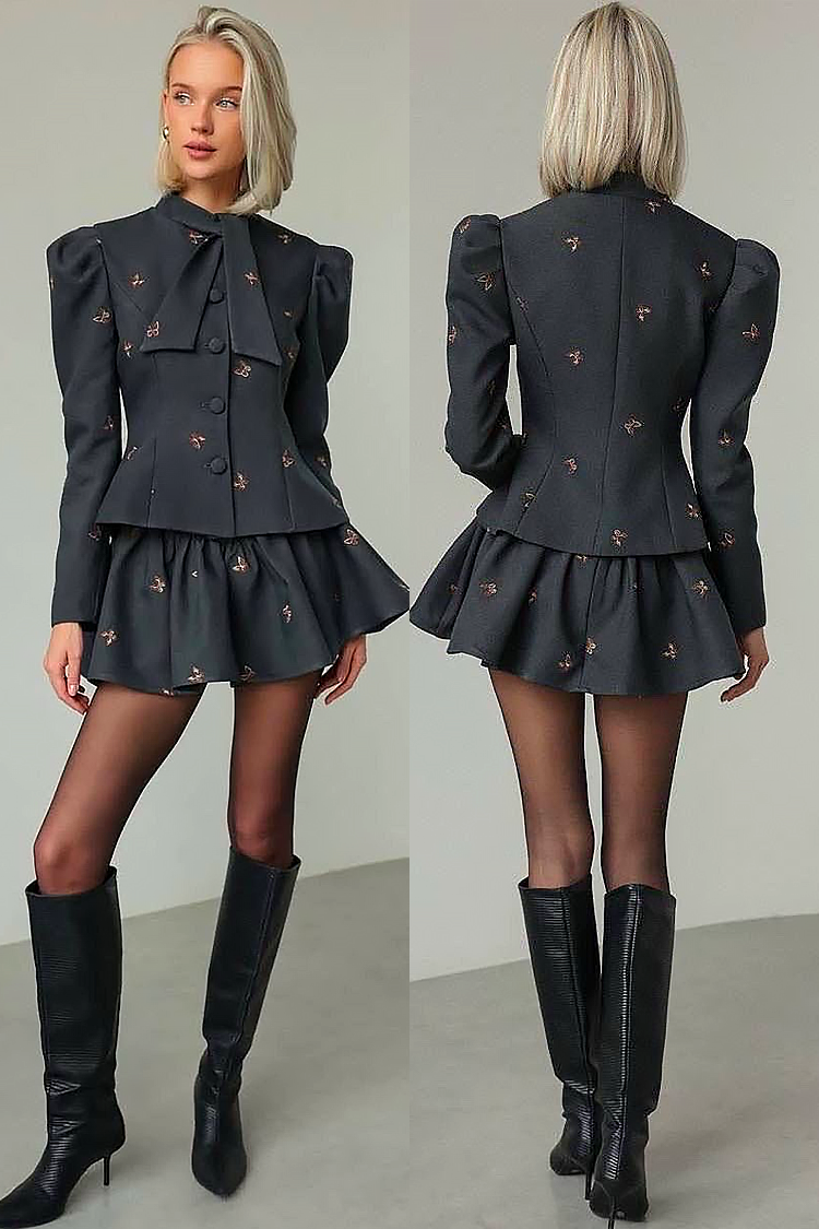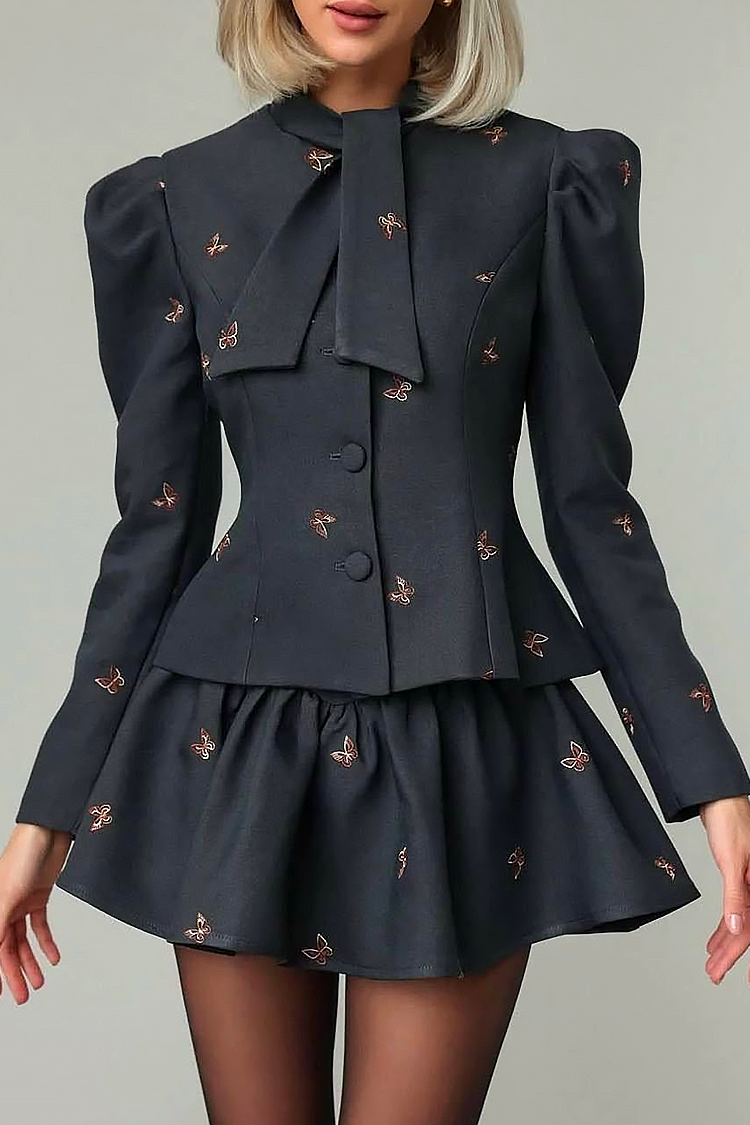 - A szoknya rövid és fodros, a felső nagy gombokkal, puffos ujjal és megkötővel rendelkezik a nyakkivágásnál.