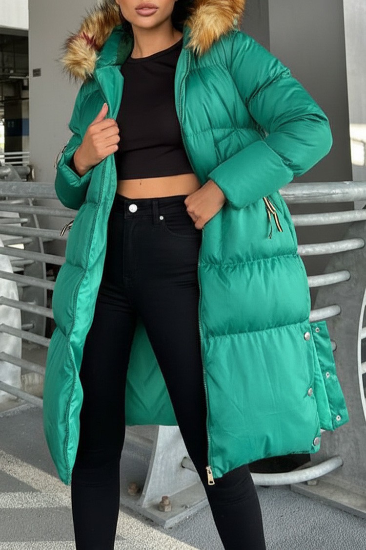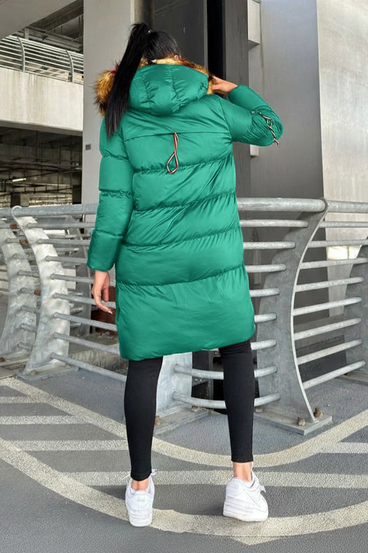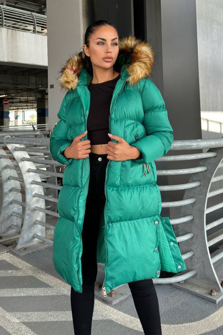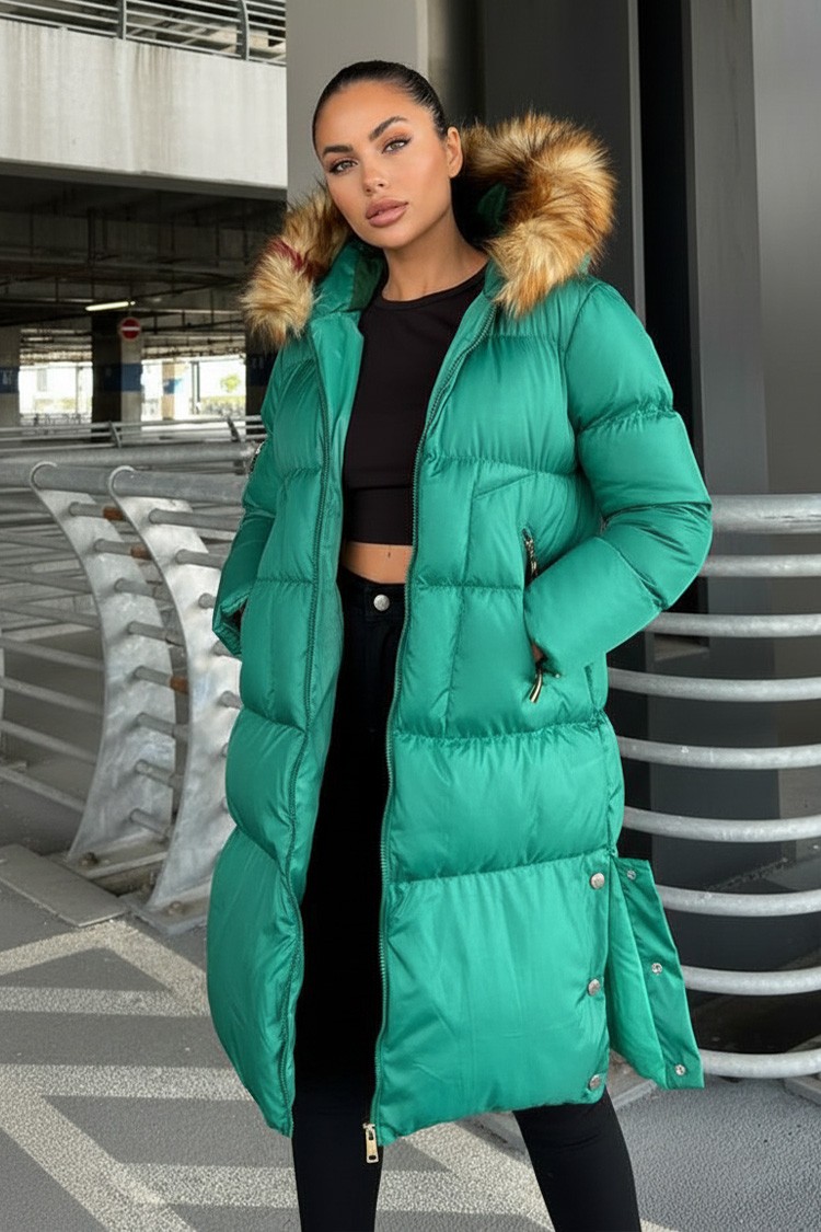 - A modell kényelmes szabással, szörmés kapucnival és cipzáras oldalsó zsebekkel rendelkezik.