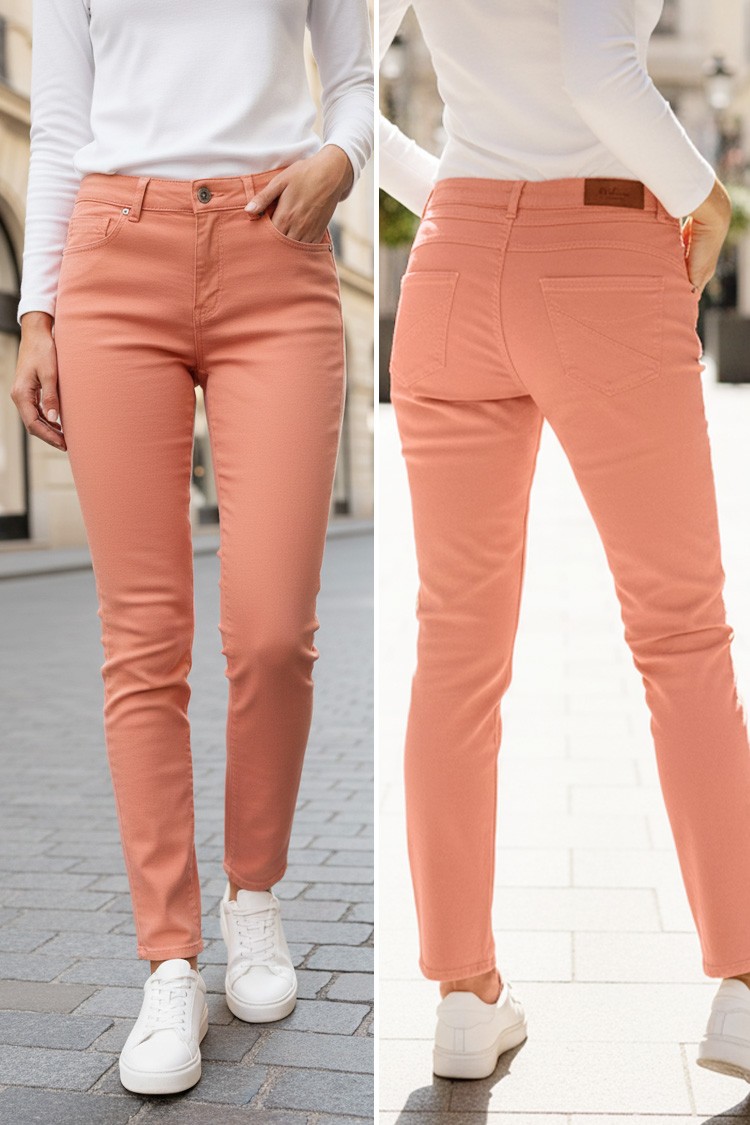 - Stílusos női nadrág standard derekú és egyenes szárú barack színben.