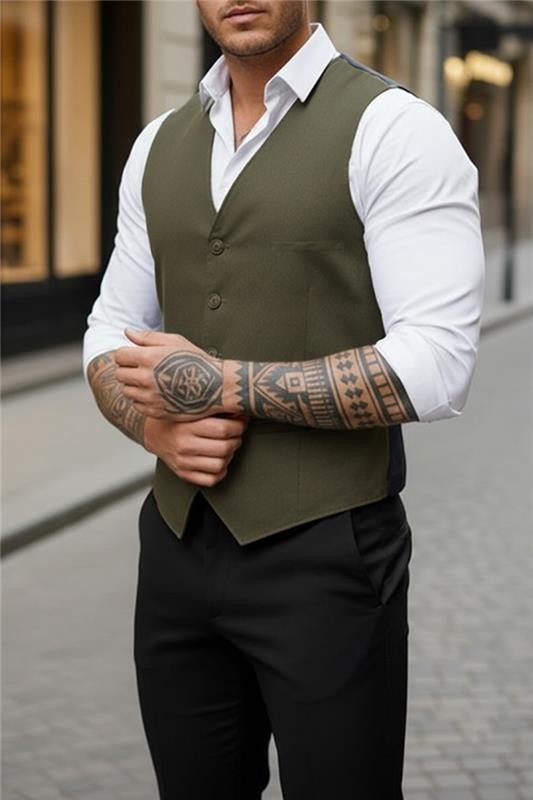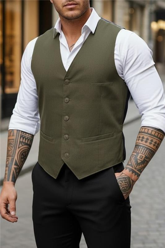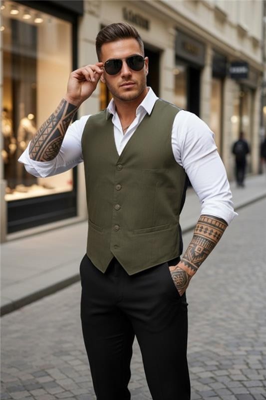 - Elegáns férfi mellény V-nyakkal és gombokkal a hosszában, khaki színben.