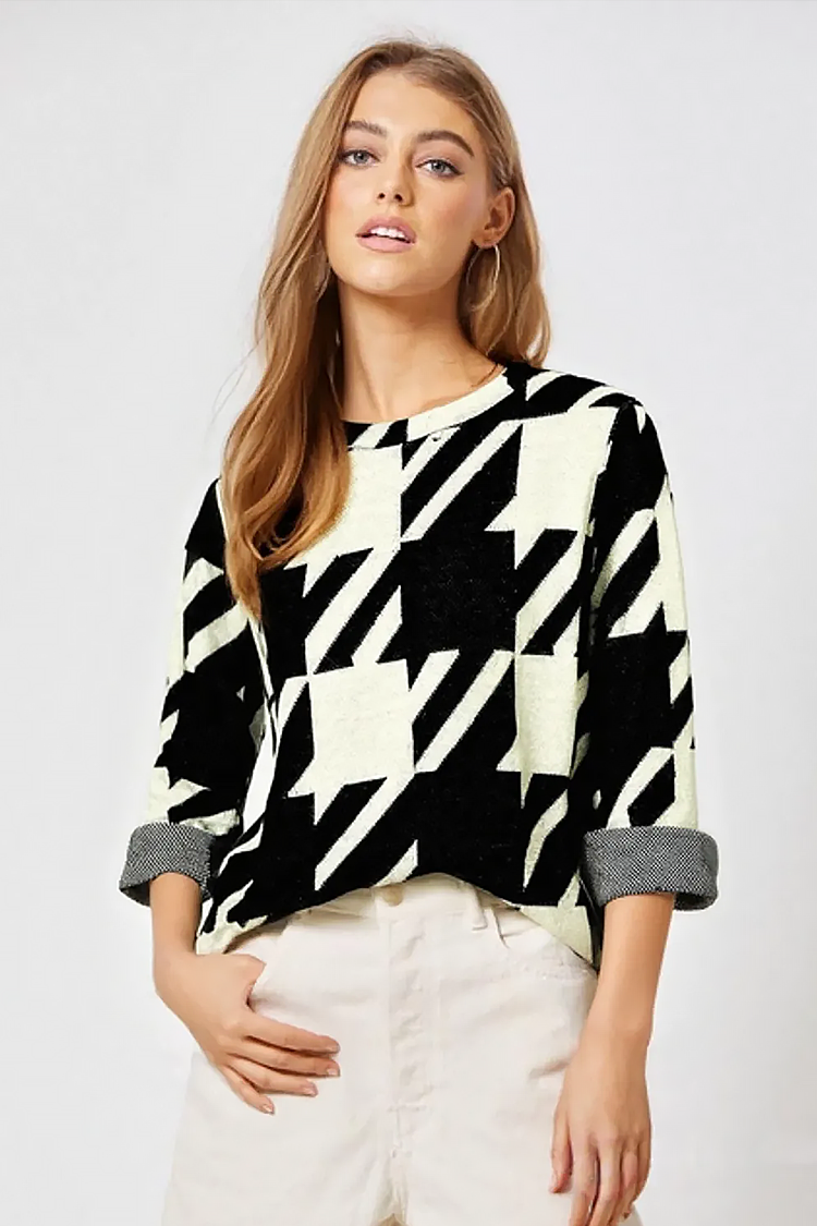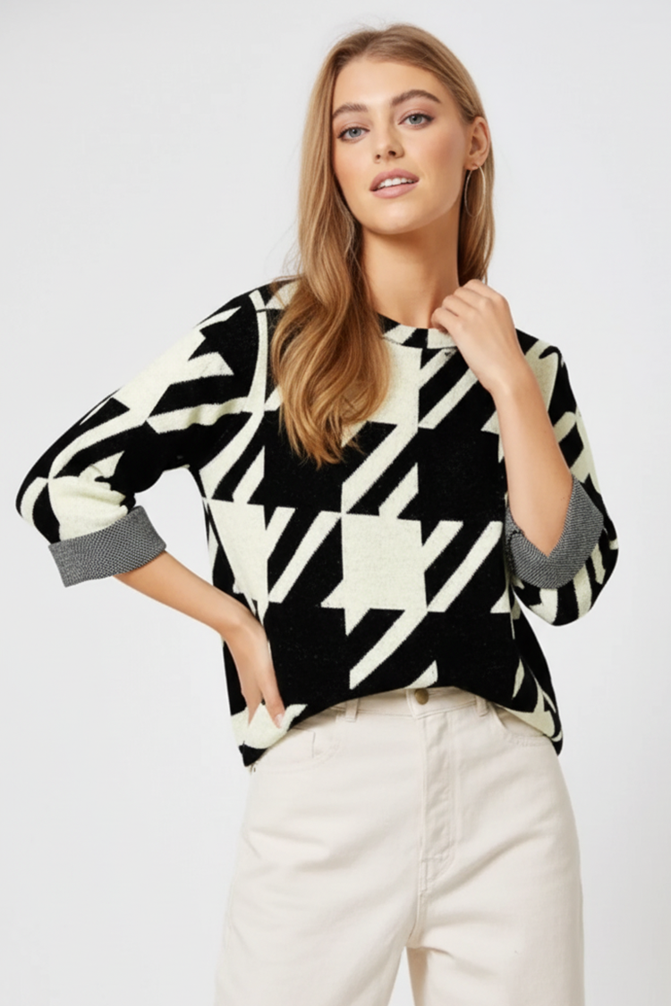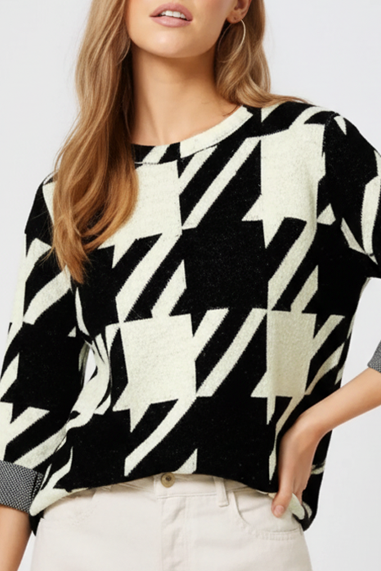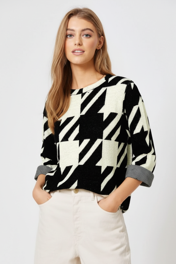 - A modell kényelmes szabással, kerek nyakkivágással és fekete-fehér mintával rendelkezik.