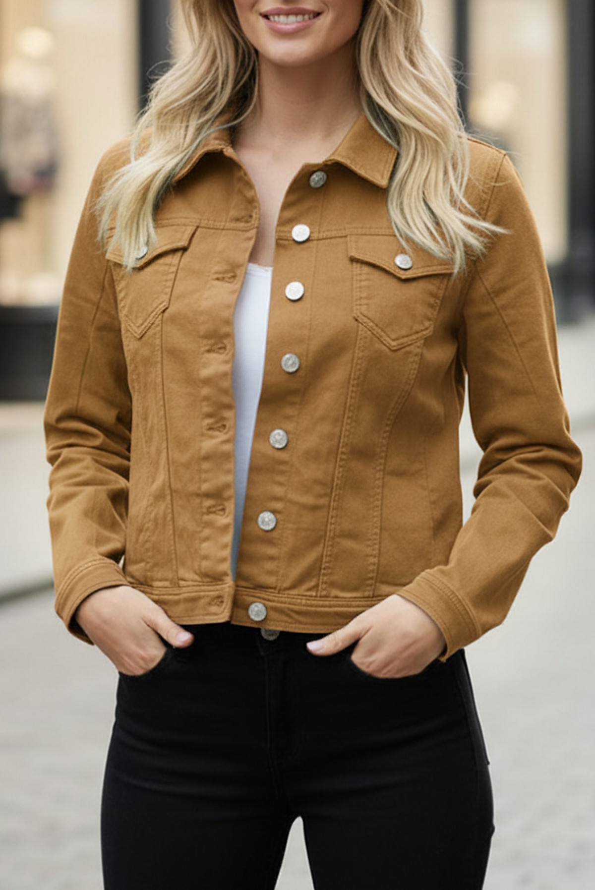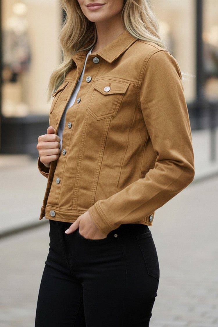- Trendi női dzseki világosbarna színben, amely különféle divatos kombinációkhoz illik.