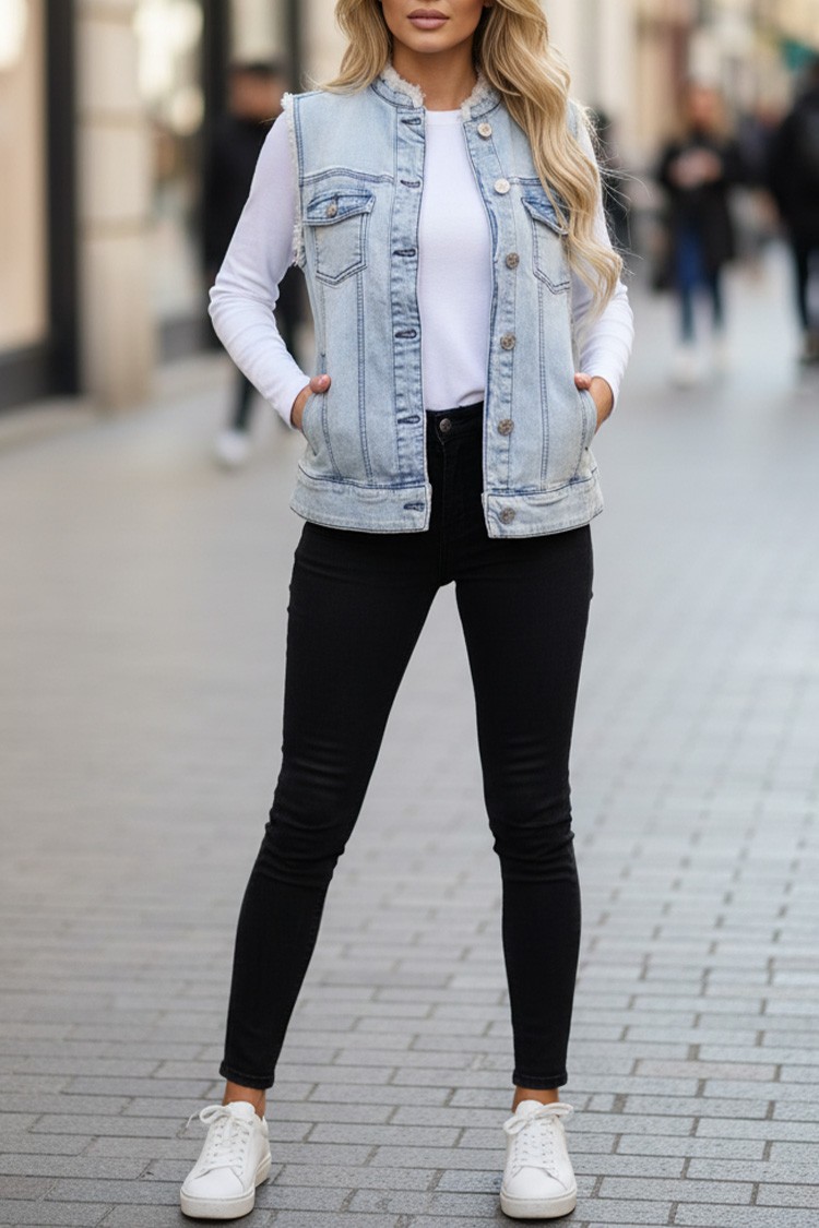 - Trendi női farmermellény világoskék színben, koptatott hatással, amely különféle divatkombinációkhoz illik.