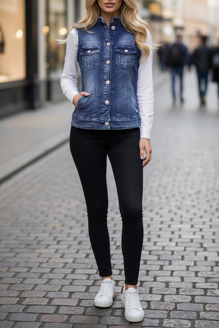 - Trendi női farmermellény kék színben, koptatott hatással, amely különféle divatkombinációkhoz illik.