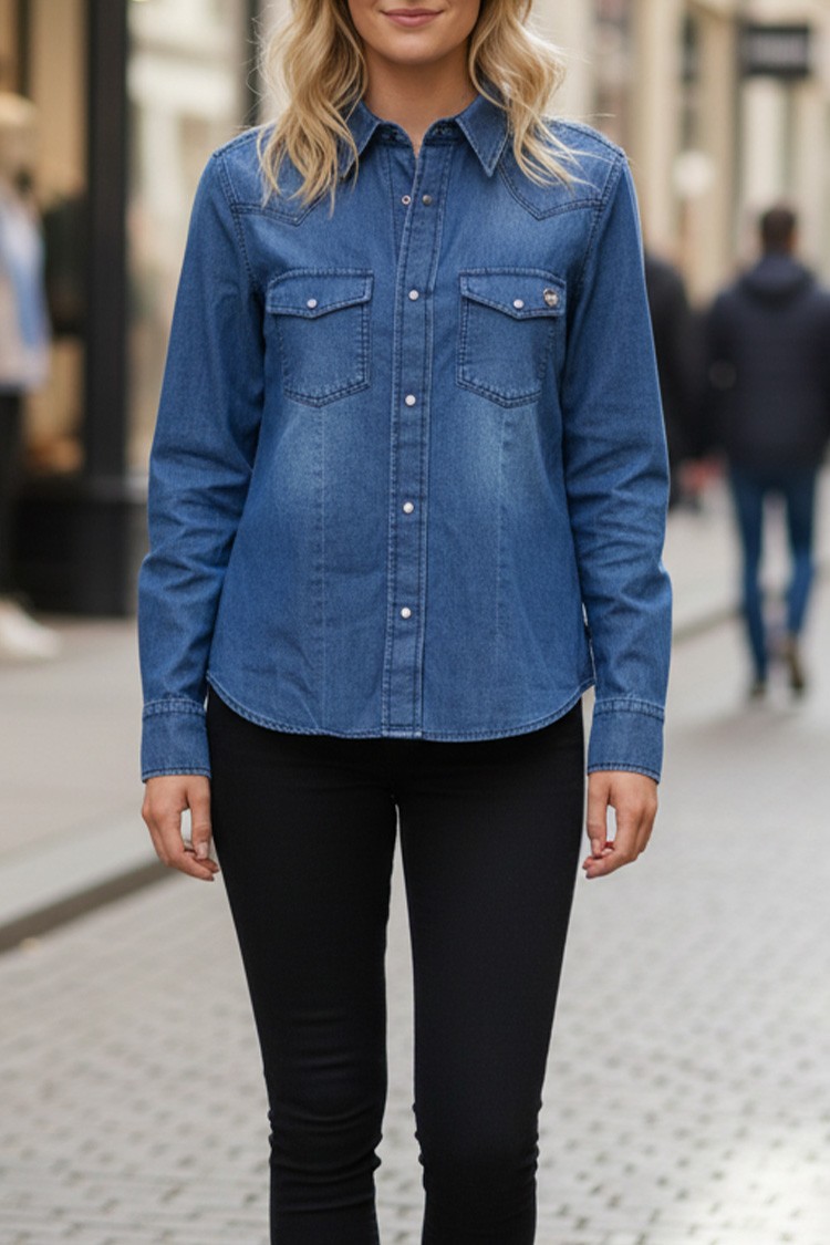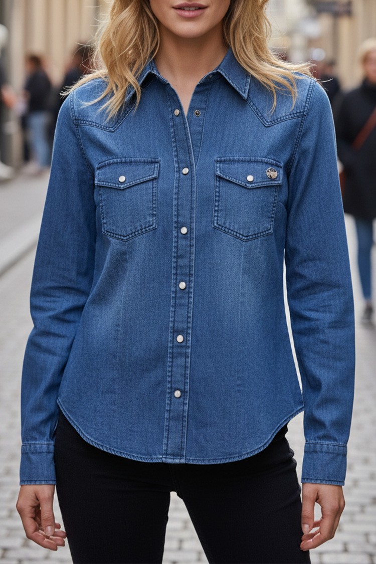 - Puha, pamut farmerből készült, laza szabású, minden alkathoz illik. A modell stílusos varrással rendelkezik, amely kiemeli az ing vonalát.