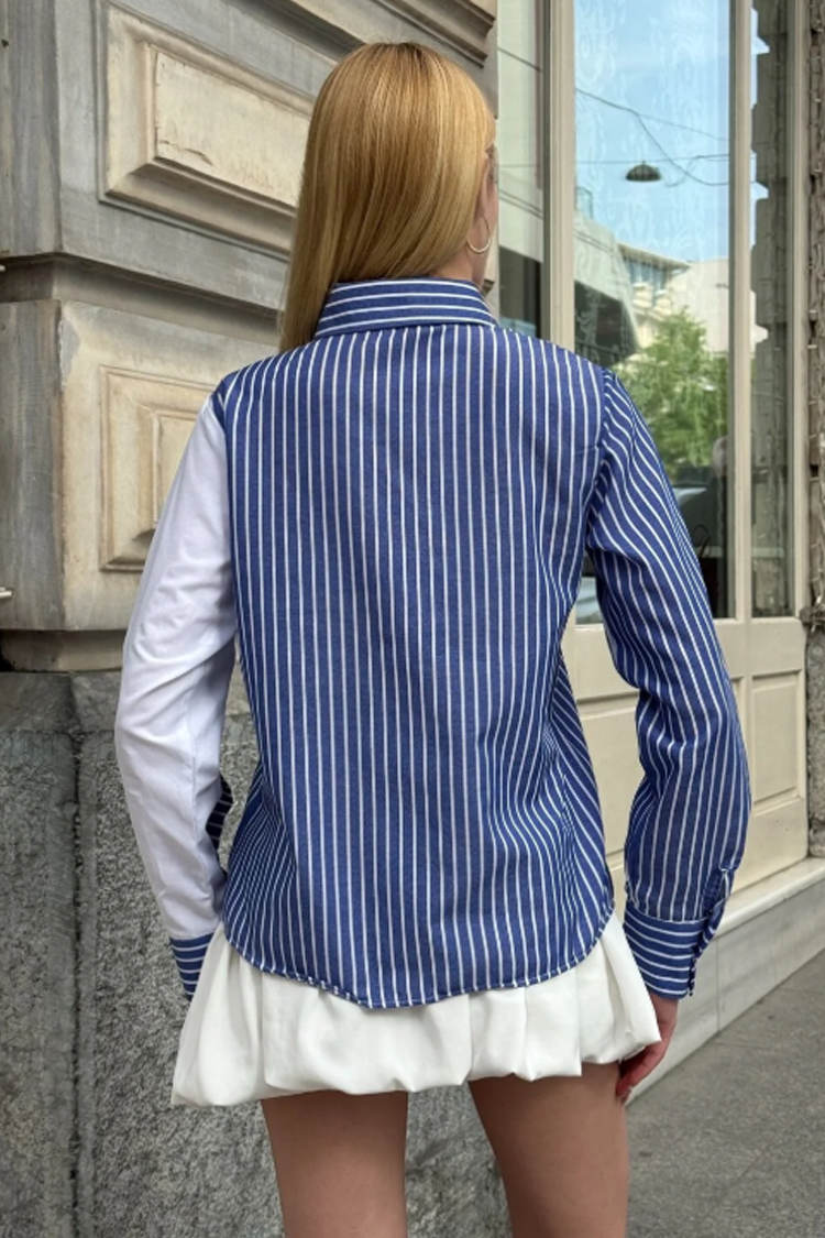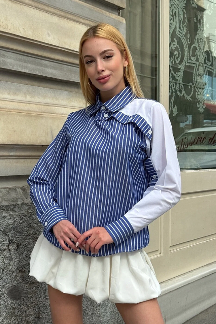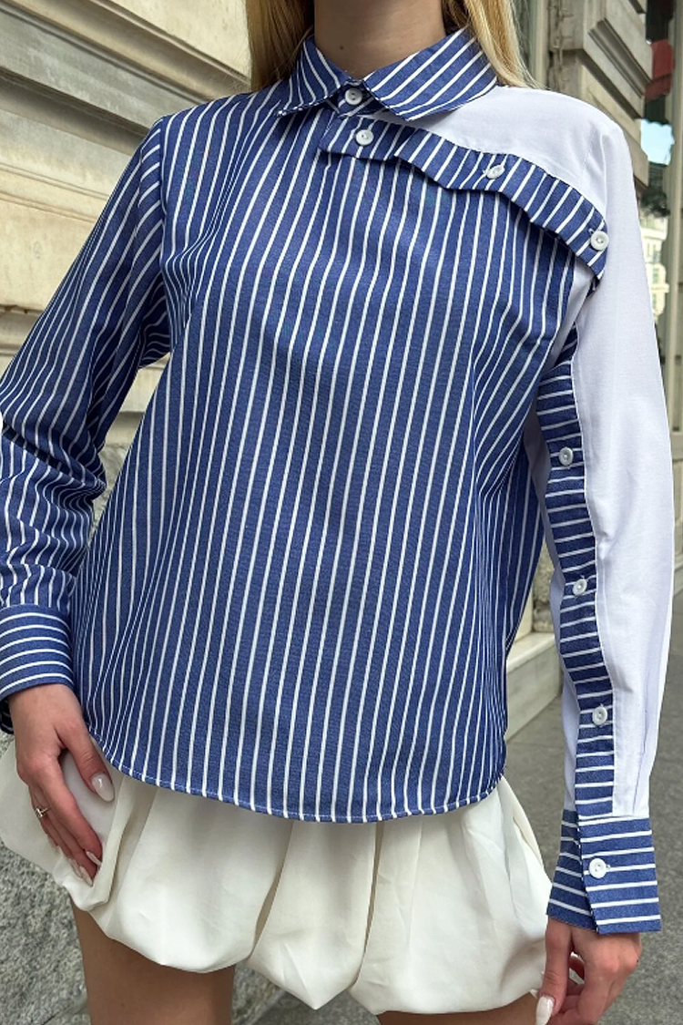 - A modell látványos szabással, gallérral, kétszínű mintával és csíkokkal rendelkezik.