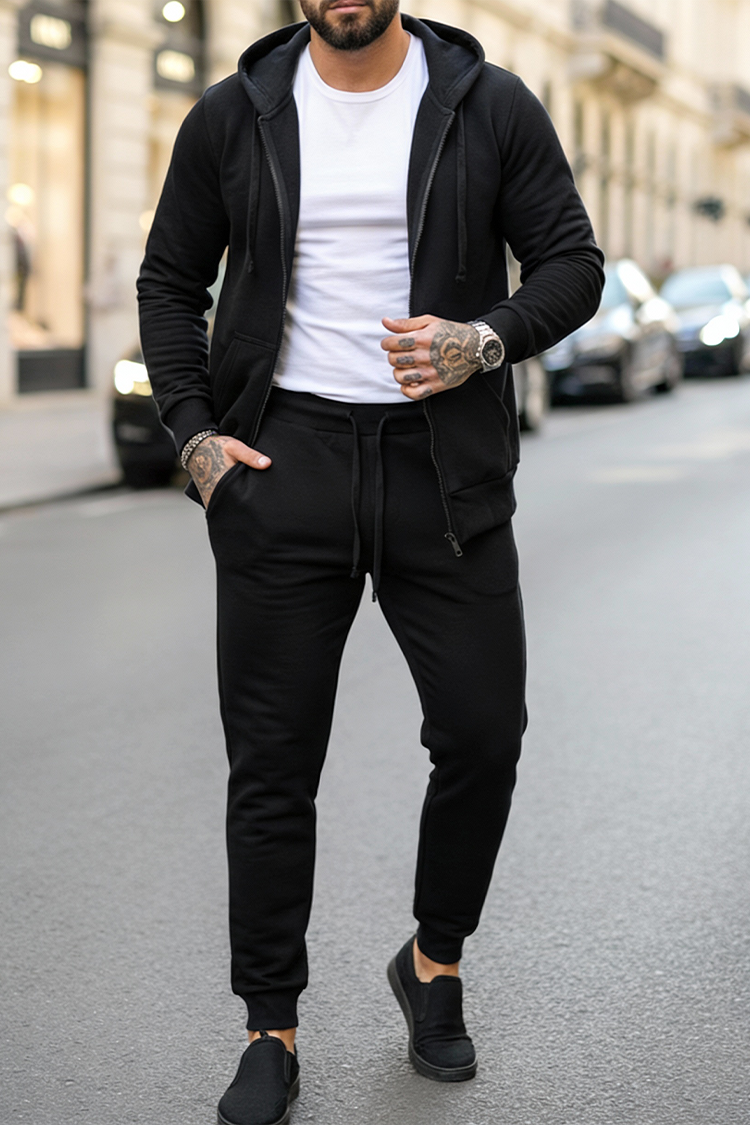- Kényelmes, kétrészes férfi szett fekete színben, amely egy kardigánból és egy nadrágból áll.