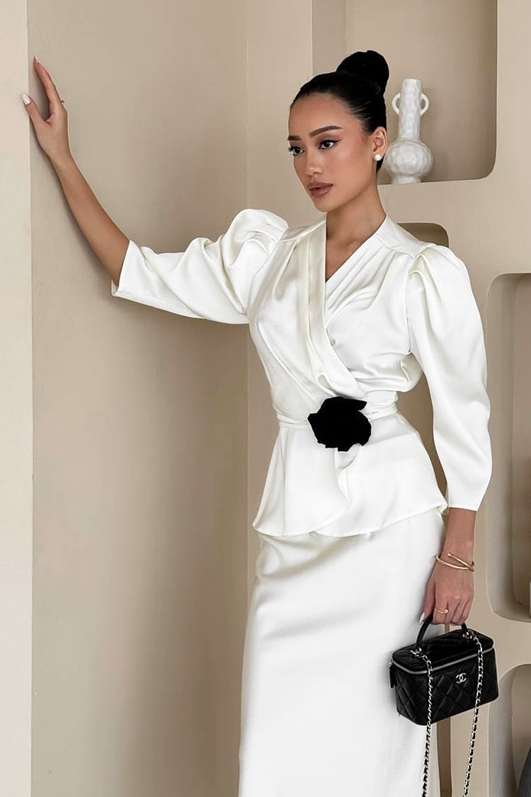 - A blúz elegáns szabású, puffos ujjú és vonzó fekete rózsával rendelkezik, a szoknya pedig testhezálló és midi hosszúságú.