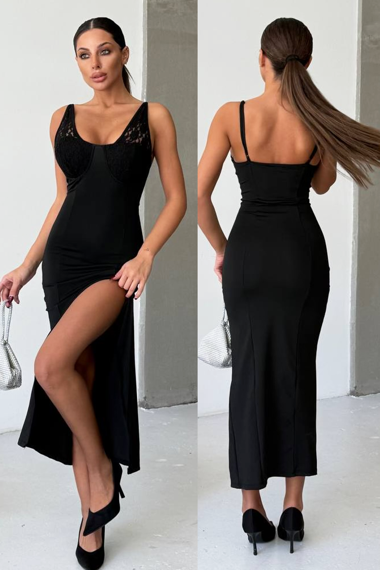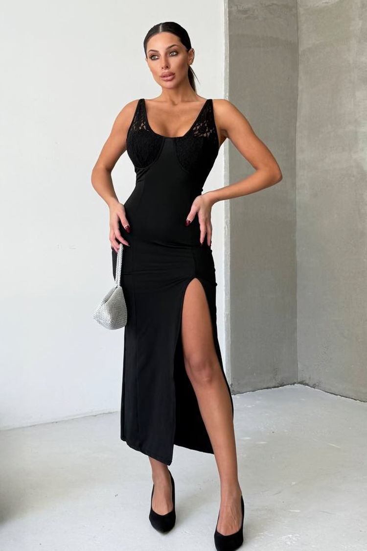 - A modell mély dekoltázzsal és szexi sliccel rendelkezik.