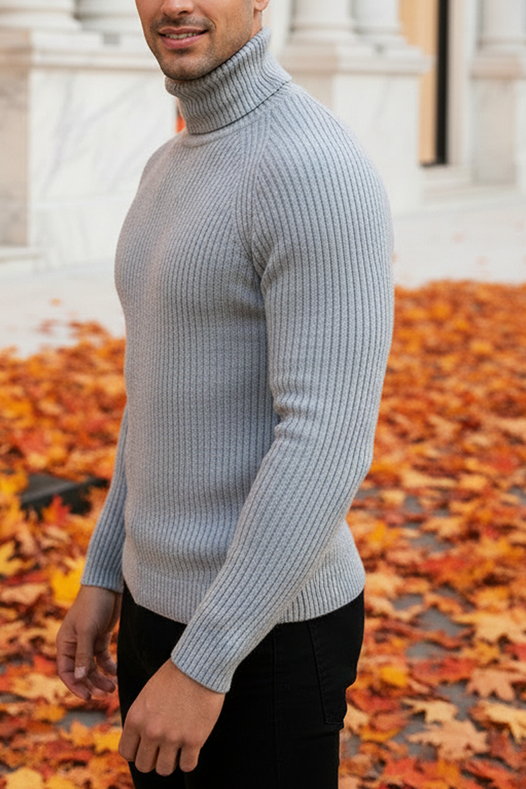 - Meleg férfi pulóver garbónyakkal, egyszerű fazonnal, szürke színben, amely különféle divatos kombinációkhoz illik.