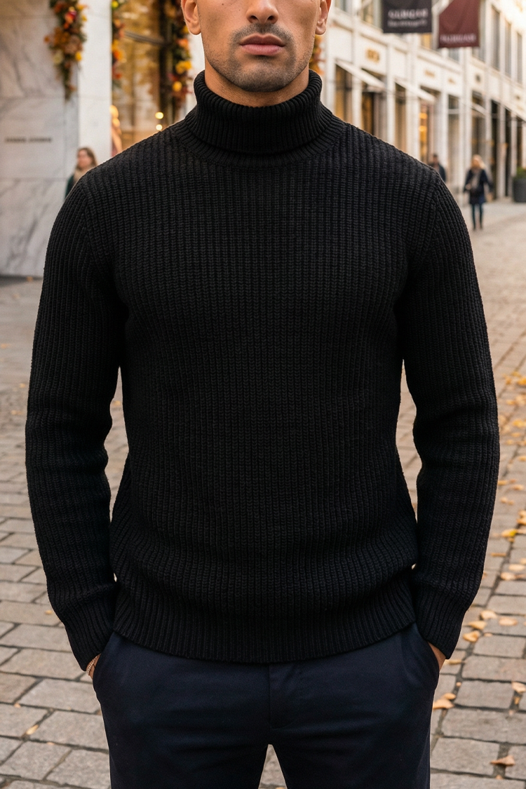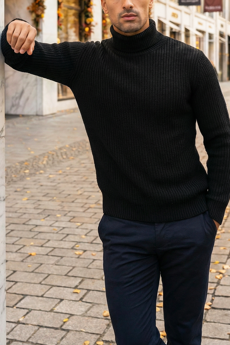 - Meleg férfi pulóver garbónyakkal, egyszerű fazonnal, fekete színben, amely különféle divatos kombinációkhoz illik.