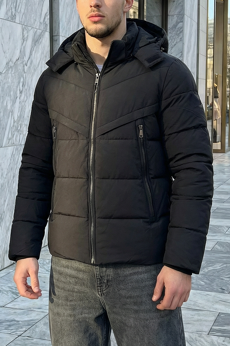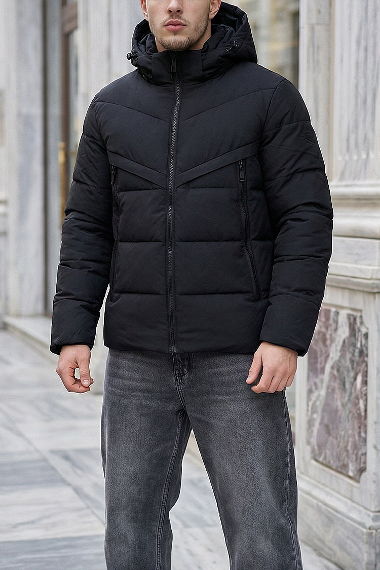 - Férfi téli dzseki meleg béléssel, magas nyakvédővel és fix kapucnival, fekete színben.