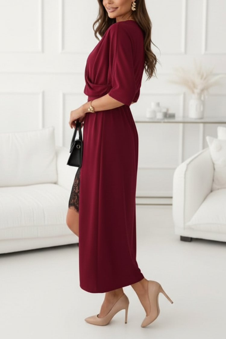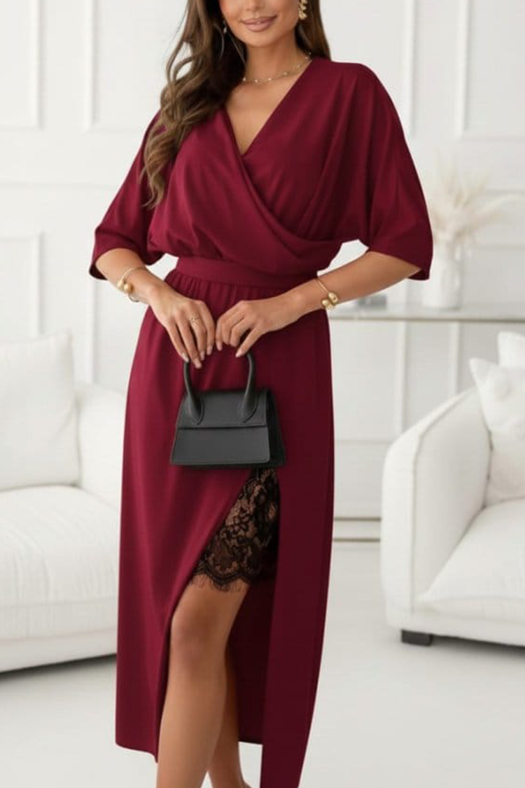 - A modell midi hosszúságú, szexi csipkével, hasítékkal, rövid ujjal és V-nyakkal rendelkezik.