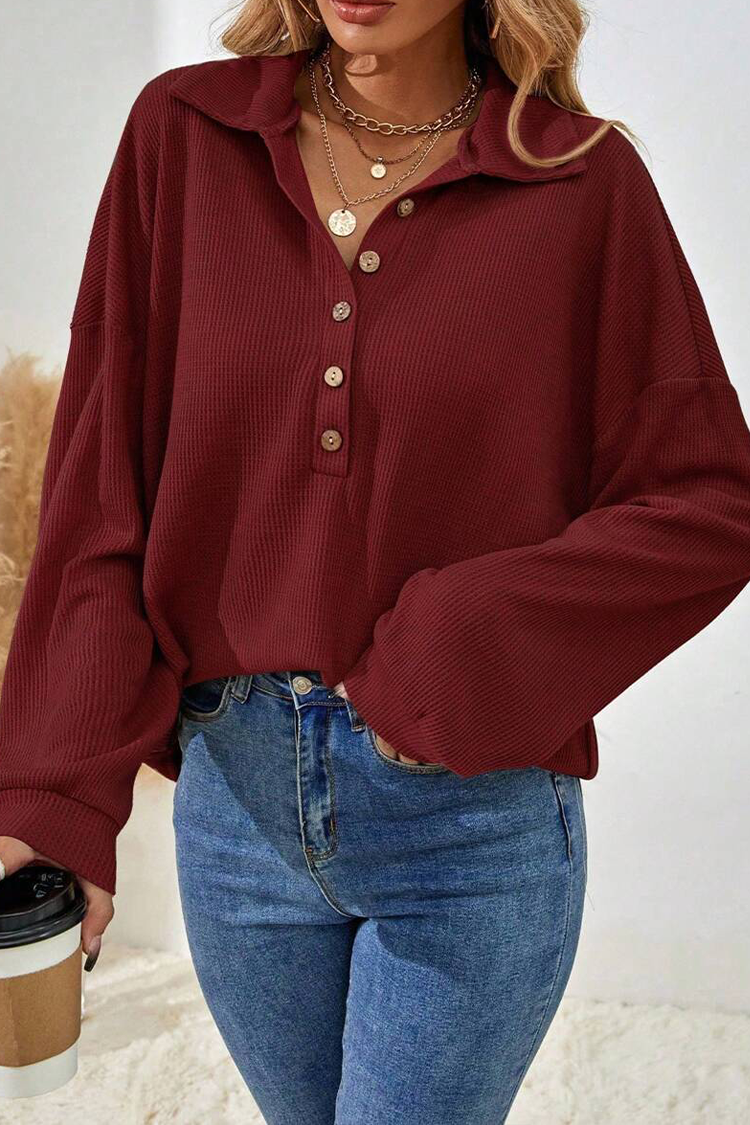 - A felső hosszú ujjú, túlméretezett szabással, gombokkal és gallérral rendelkezik.