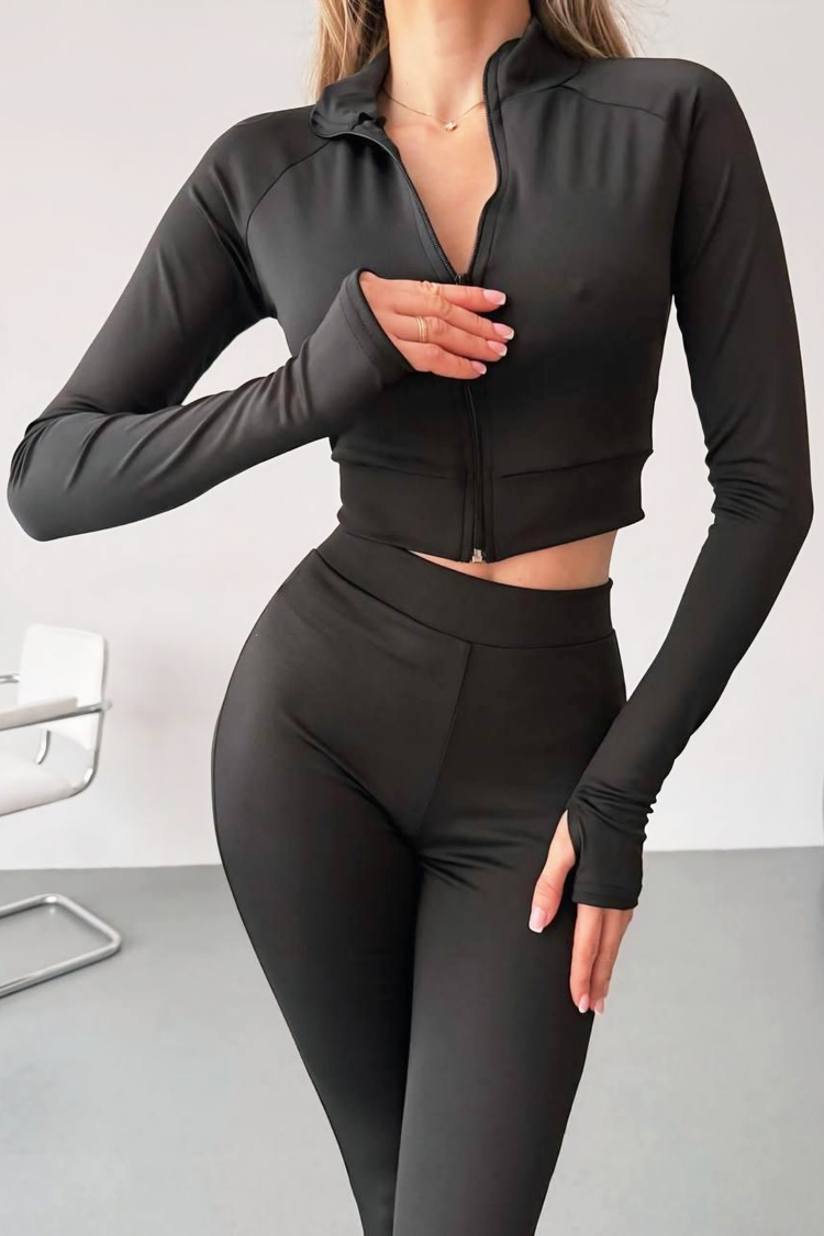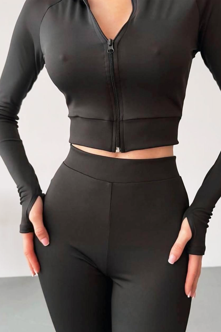 - A kardigán rövid fazonú a hüvelykujjnál-lyukas, a leggings pedig magas, rugalmas derékkal rendelkezik.