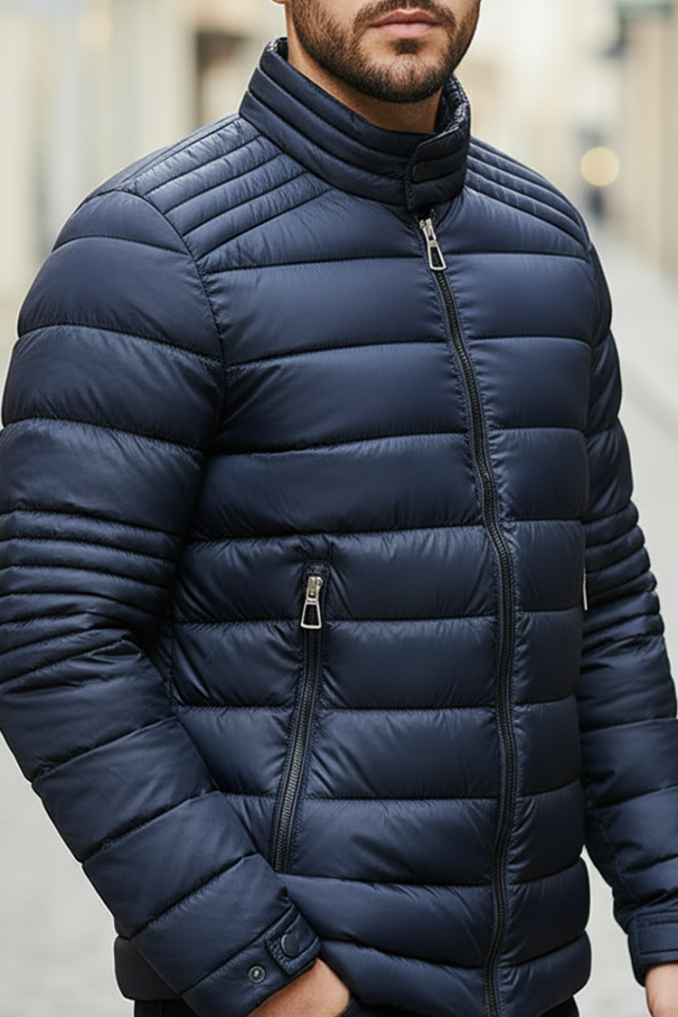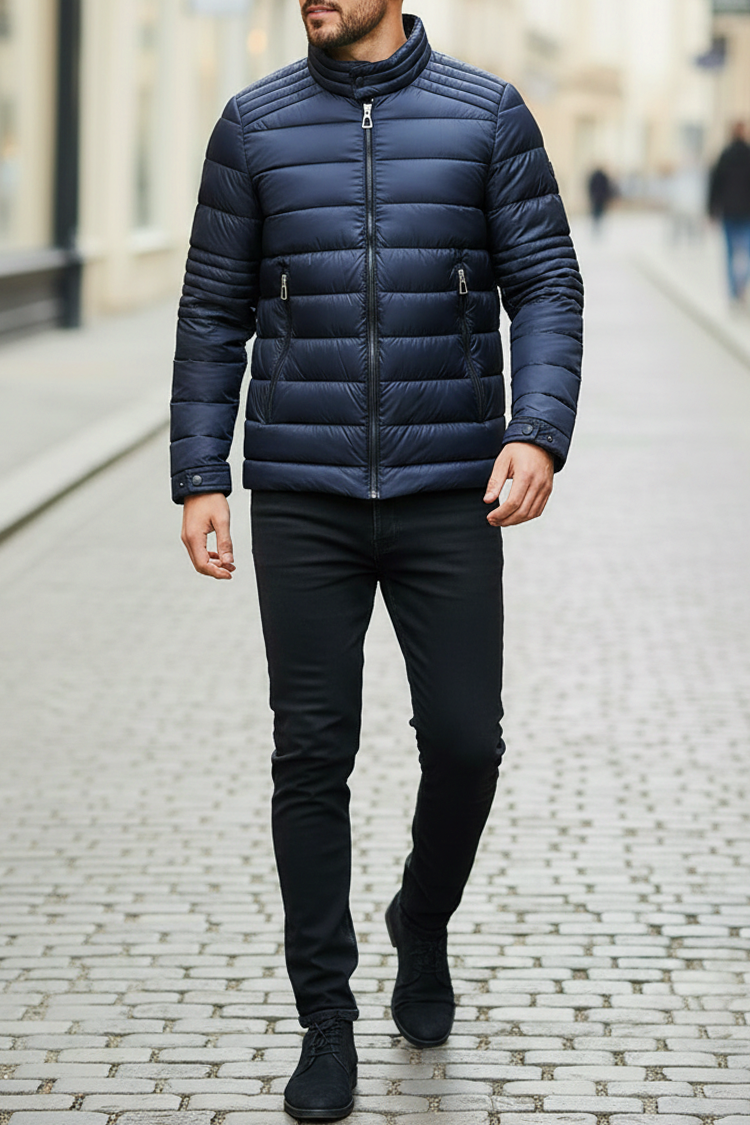 - Kényelmes férfi dzseki steppelt mintával és magas gallérral, patenros gombbal, sötétkék színben, sportos-hétköznapi stílusban.