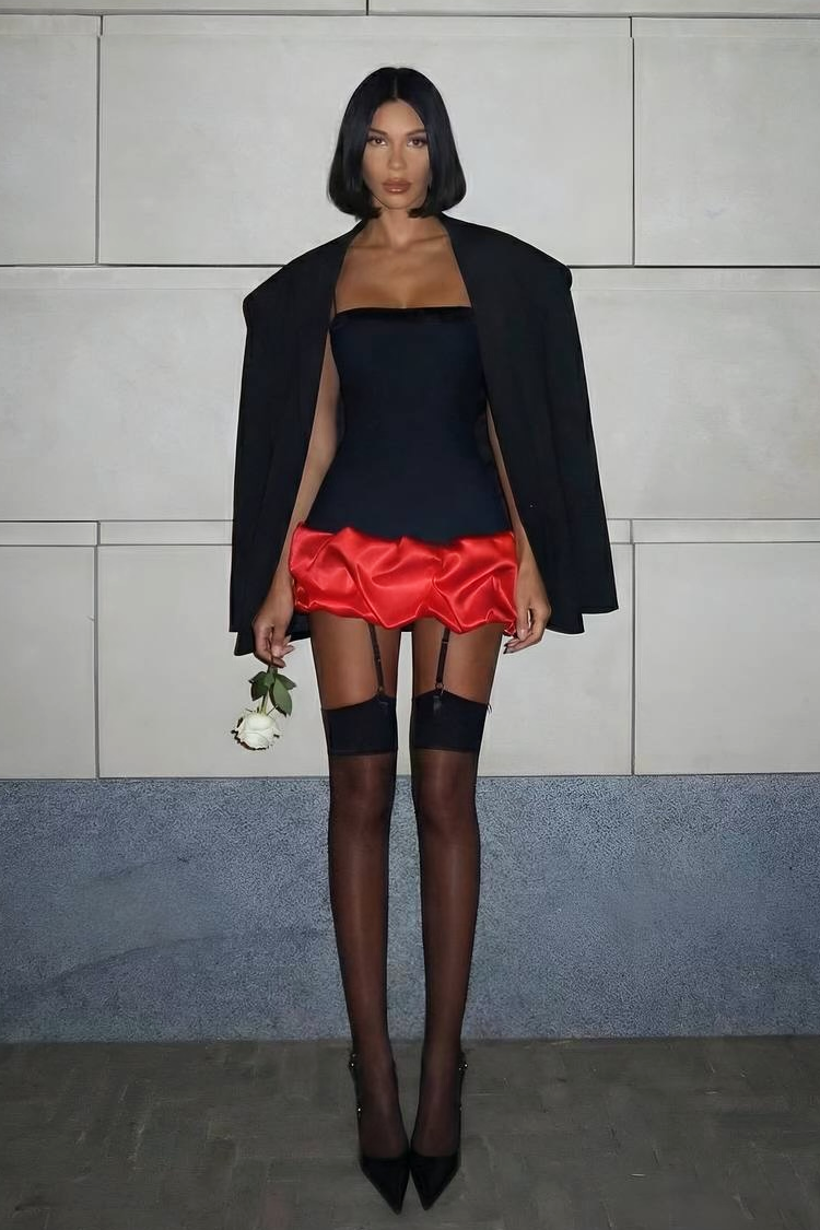 - A modell testhezálló szabású, vékony pántos, rövid fazonú és szatén résszel rendelkezik.