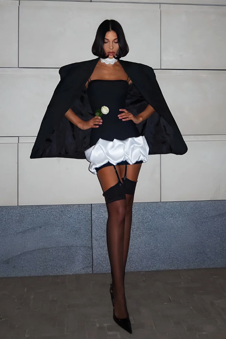 - A modell testhezálló szabású, vékony pántos, rövid fazonú és szatén résszel rendelkezik.
