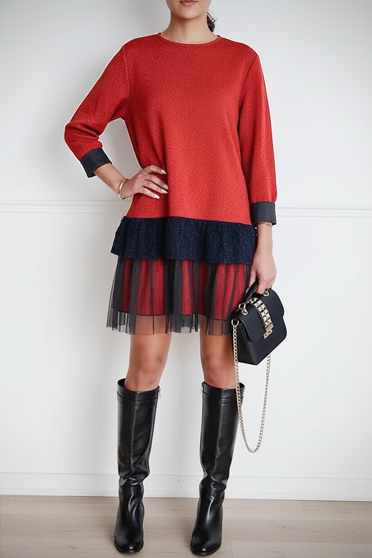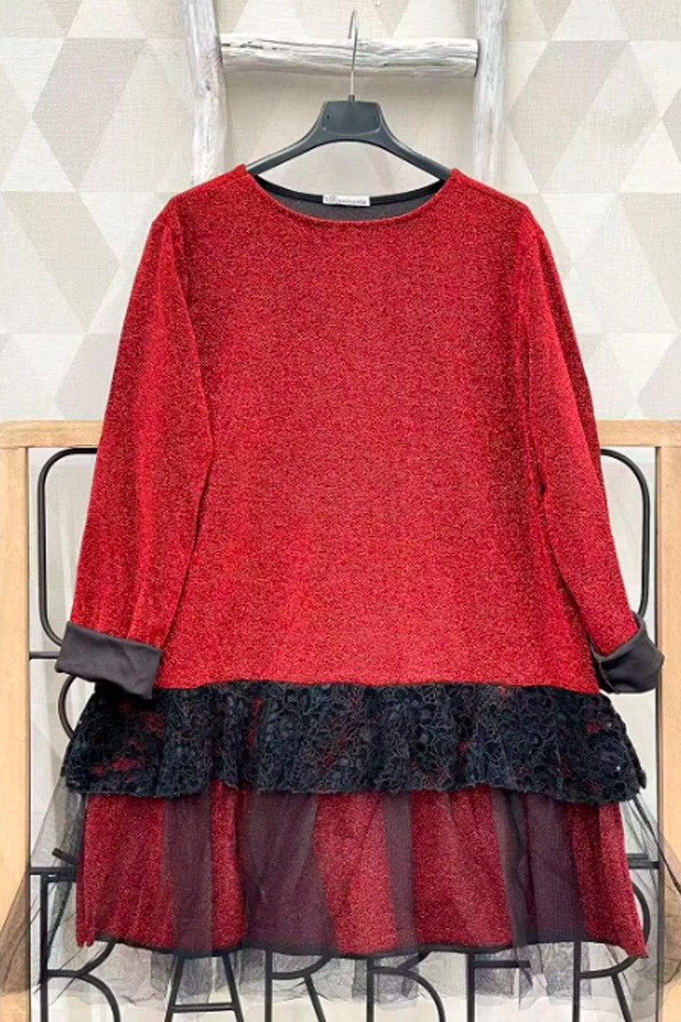 - A modell laza szabású, hosszú ujjú és finom csipkével díszített az alján.