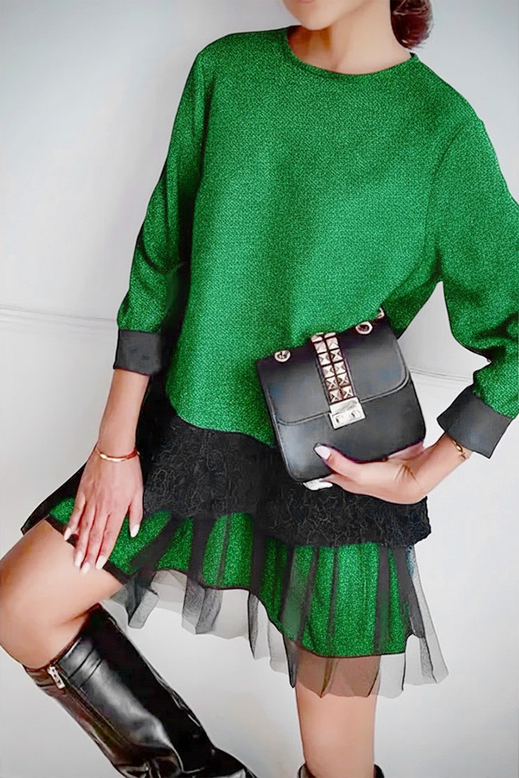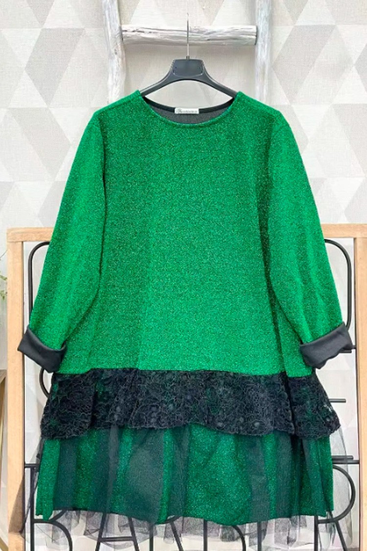 - A modell laza szabású, hosszú ujjú és finom csipkével díszített az alján.