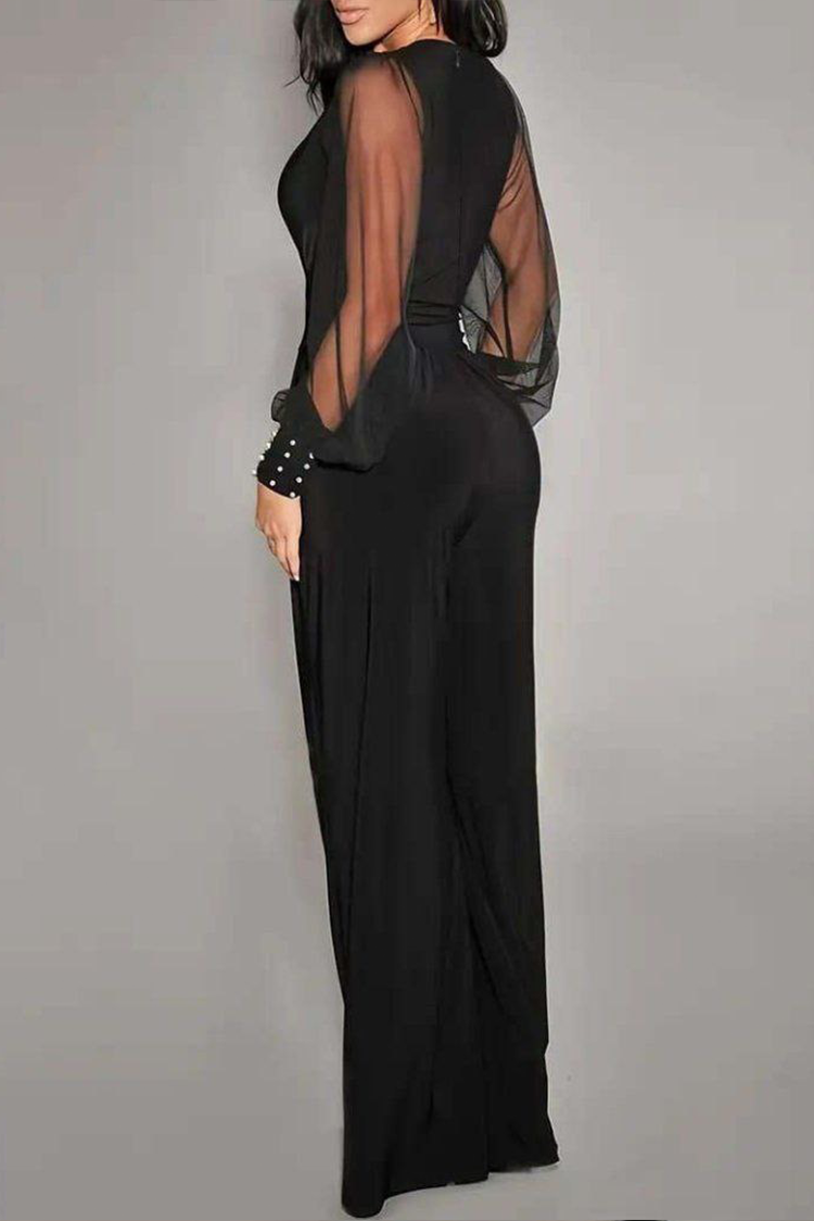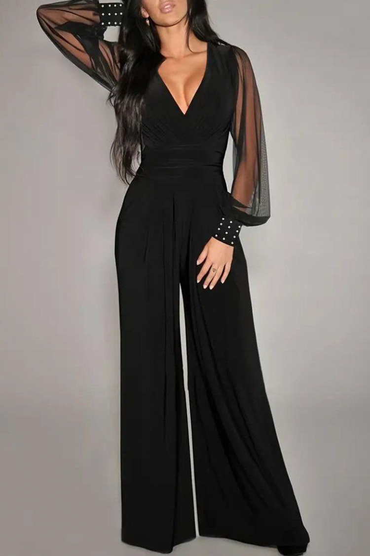 - A modell laza szabású, mély V dekoltázzsal és széles, átlátszó ujjal.