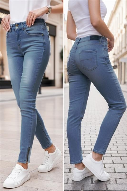 - A középmagas derék tökéletes illeszkedést biztosít. A modell cipzárral és gombokkal záródik.