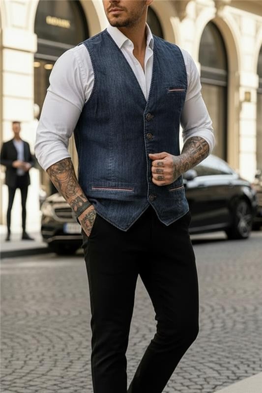 - Praktikus férfi mellény bő szabással sötétkék színben, amely különféle divatos kombinációkhoz illik.