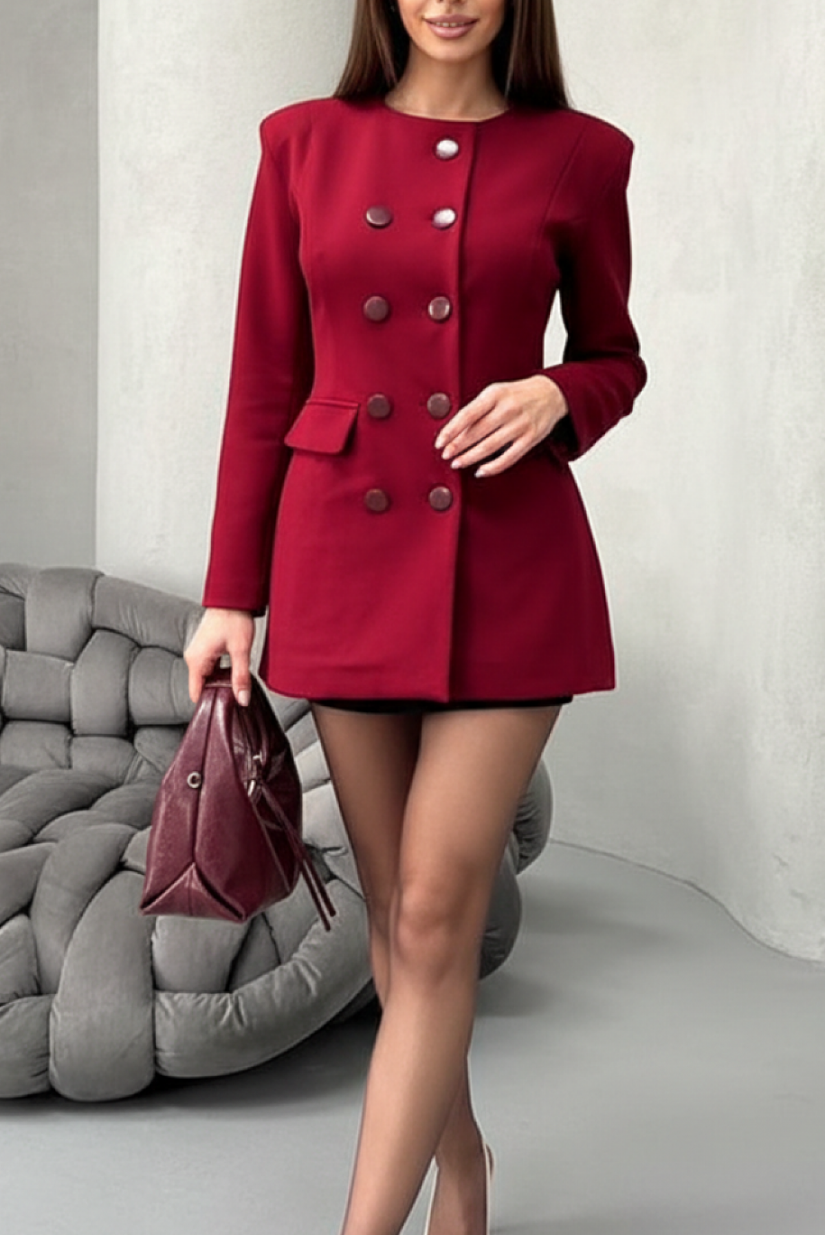 - A modell szexi szabású, hosszú ujjú, testhezálló és dupla gombos rögzítésű.