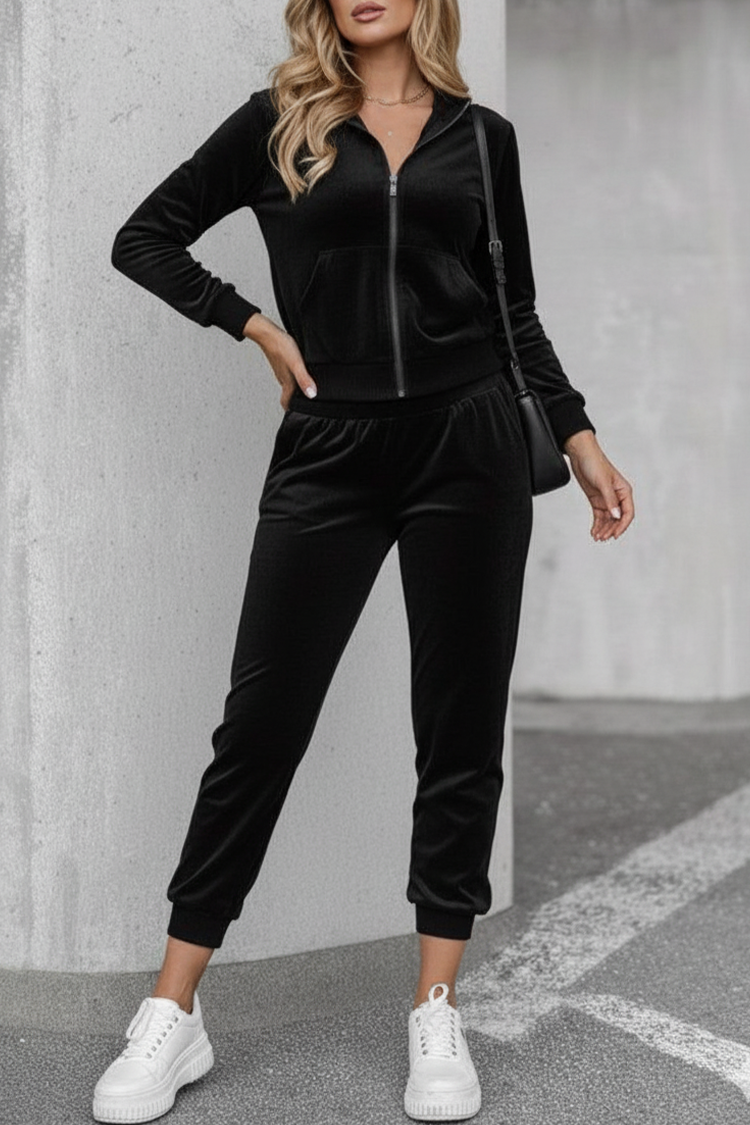 - A kardigán cipzáras és kapucnis, a nadrág pedig magas derekú és oldalsó zsebekkel rendelkezik.