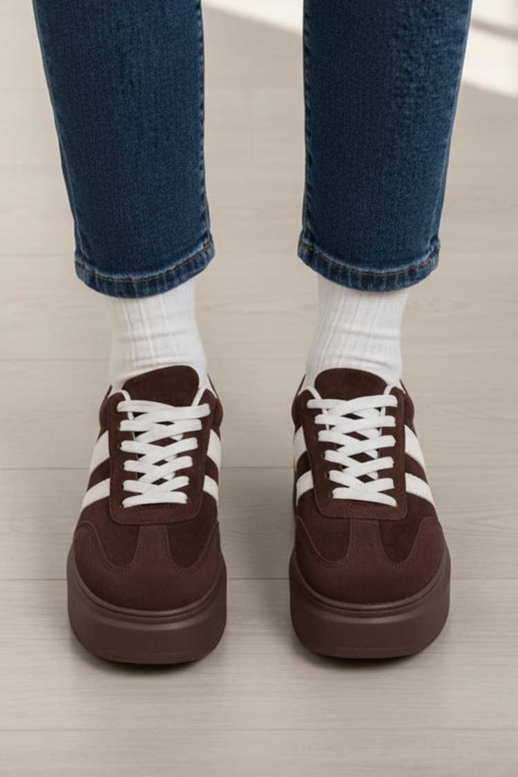 - Barna színű, öko velúrból készült női tornacipő, fűzős és platformos, mindennapi viseletre alkalmas.