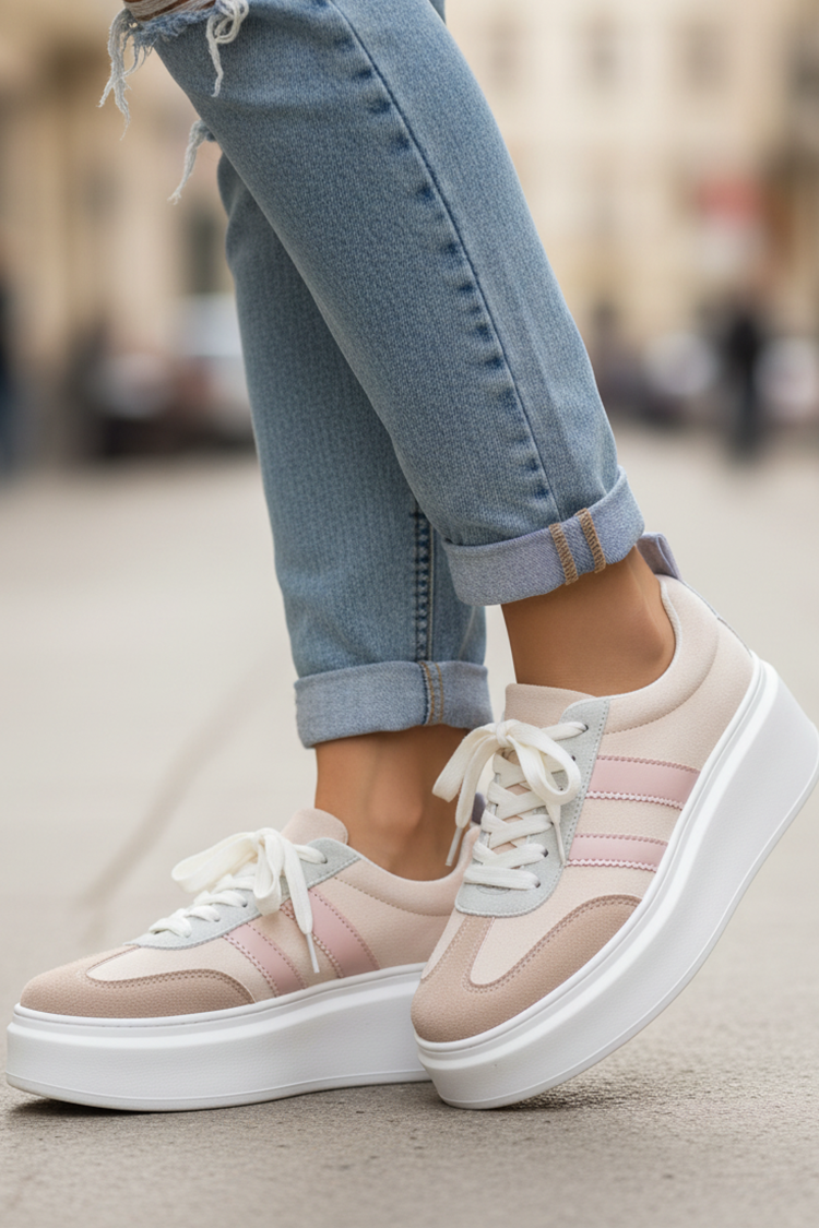 - Puder színű, öko velúrból készült női tornacipő, fűzős és platformos, mindennapi viseletre alkalmas.