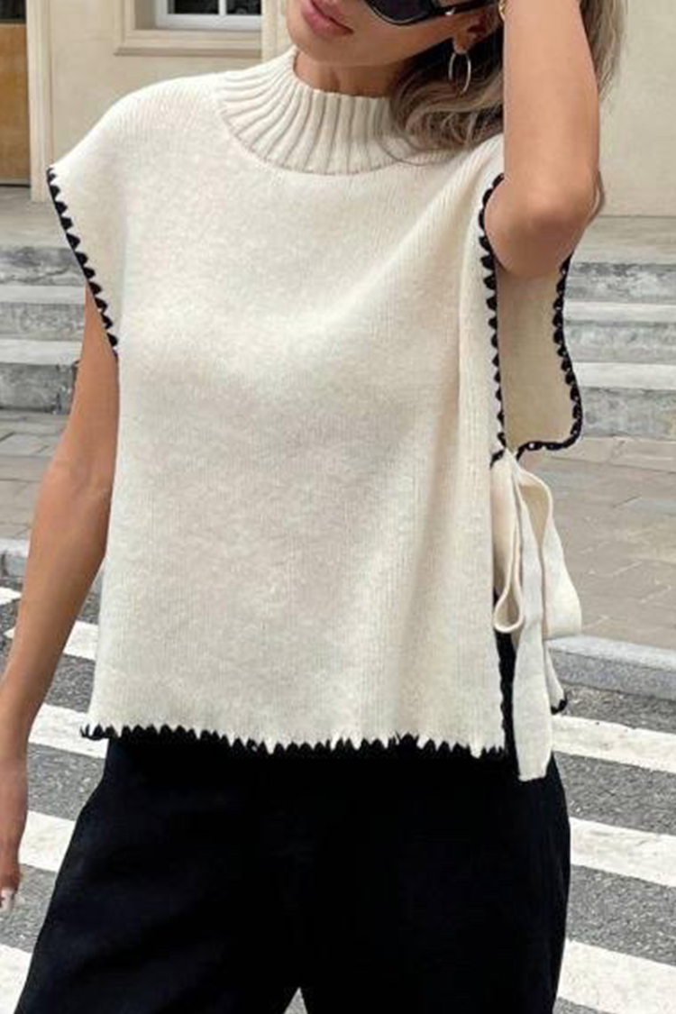 - A modell elegáns nyakkivágással, ujjatlan, oldalsó megkötőkkel és fekete részletekkel rendelkezik.
