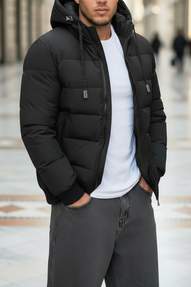- Férfi télikabát meleg béléssel, steppelt mintával és fix kapucnival fekete színben.