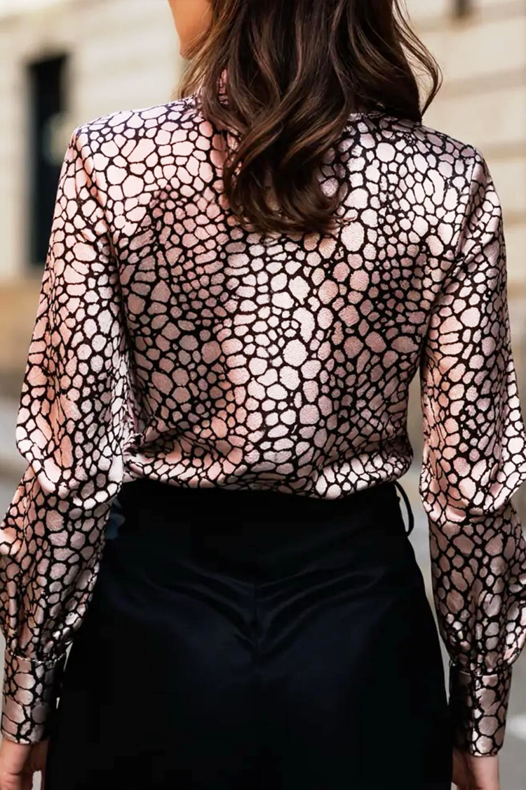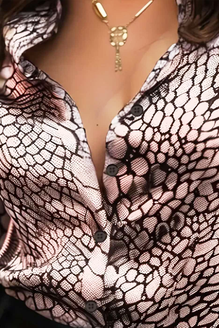 - A blúz hosszú ujjú, hosszában végig gombos záródással, gallérral és kígyómintával rendelkezik.