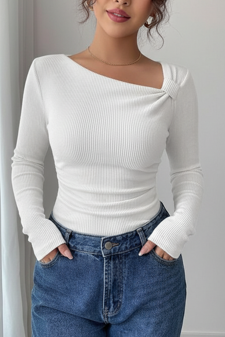 - A modell hosszú ujjú, testhezálló szabású, egyszínben, aszimmetrikus nyakkivágással rendelkezik.