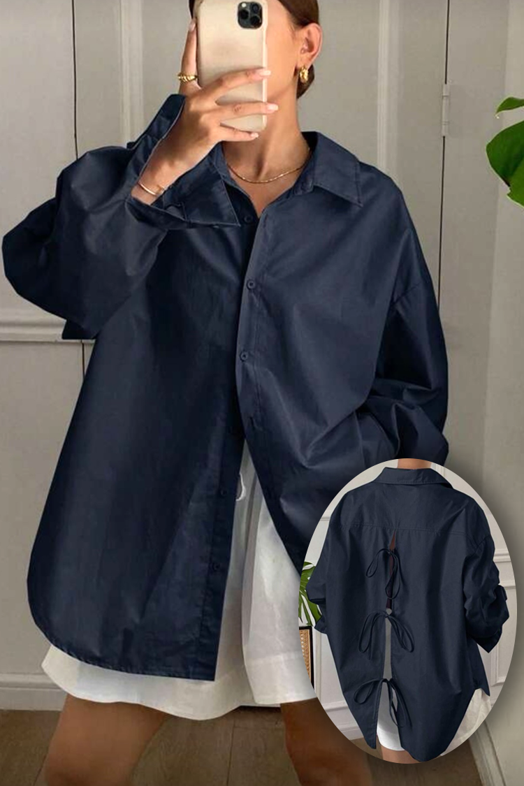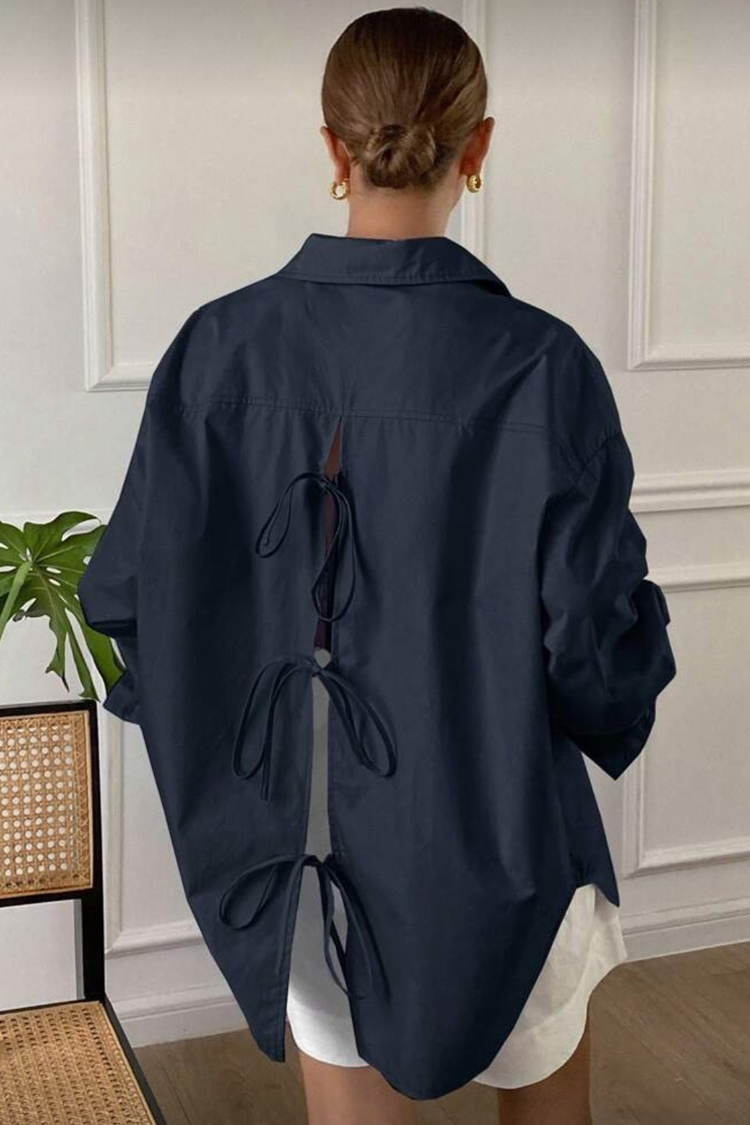 - A modell hosszú ujjú, túlméretezett szabású, elöl gombokkal rögzíthető, és látványos hátrésszel, dísz szalagokkal.
