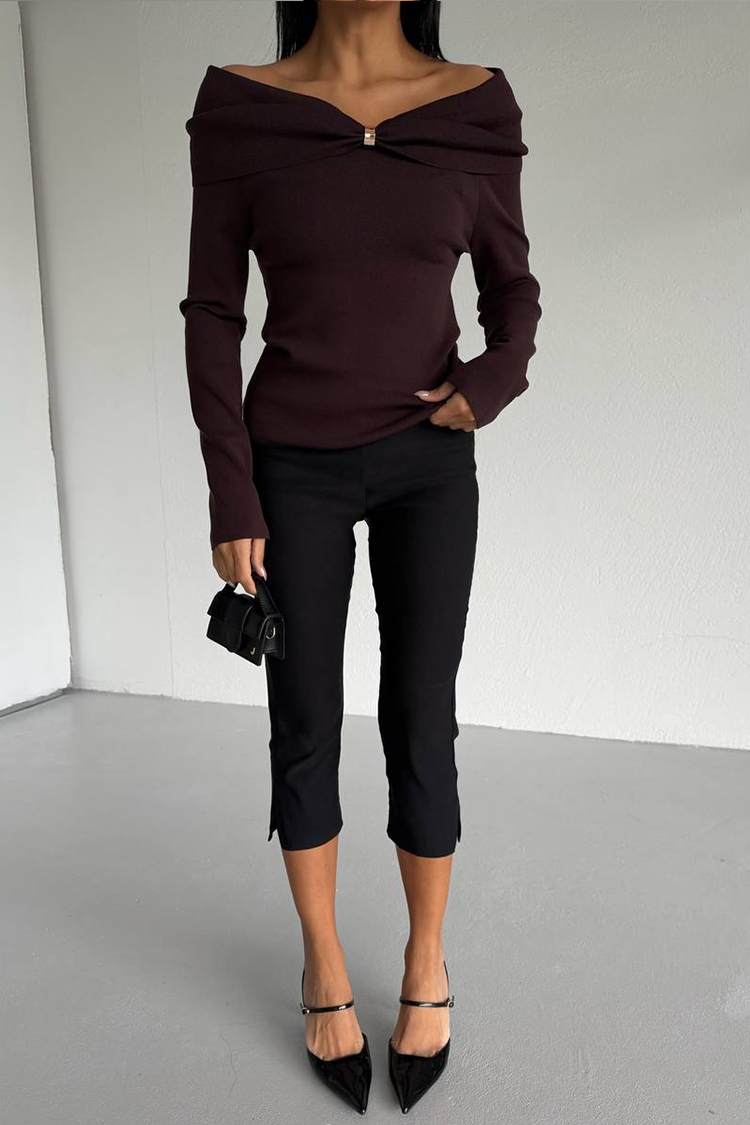 - A modell hosszú ujjú, testhezálló szabású, egyszínben vonzó dizájnnal rendelkezik, elöl fém díszítéssel.