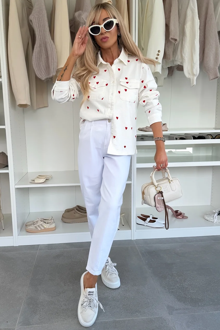 - A modell hosszú ujjú, galléros, gombbal záródó és vonzó szívmintával rendelkezik.