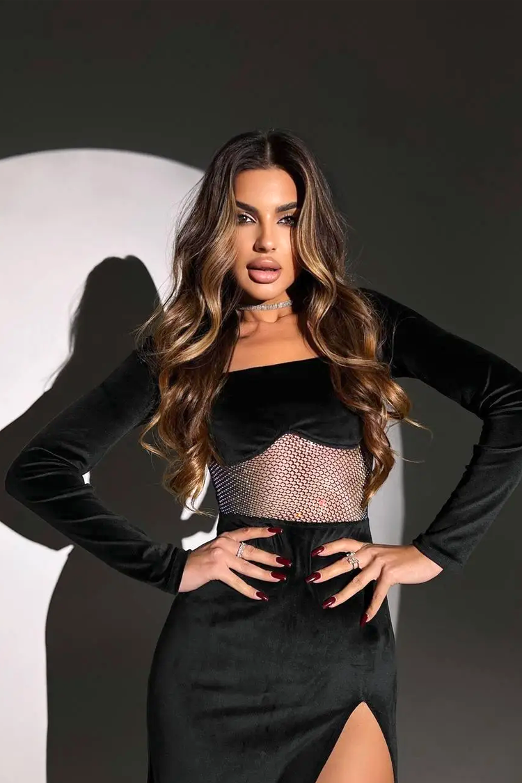 - A modell midi hosszúságú, fekete színű, bársonyhatású, testhezálló szabású és oldalán magas hasítékkal rendelkezik.