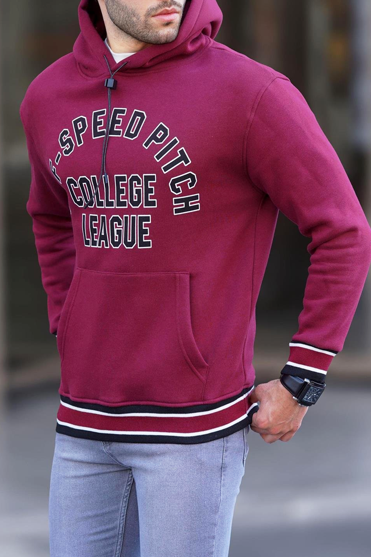 - Praktikus férfi pulóver kontrasztos felirattal, megkötős kapucnival és maxi zsebbel bordó színben.